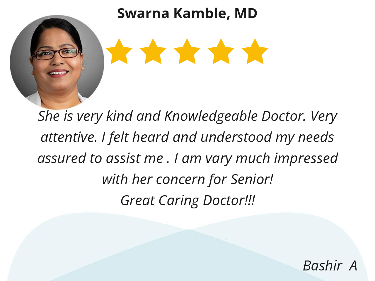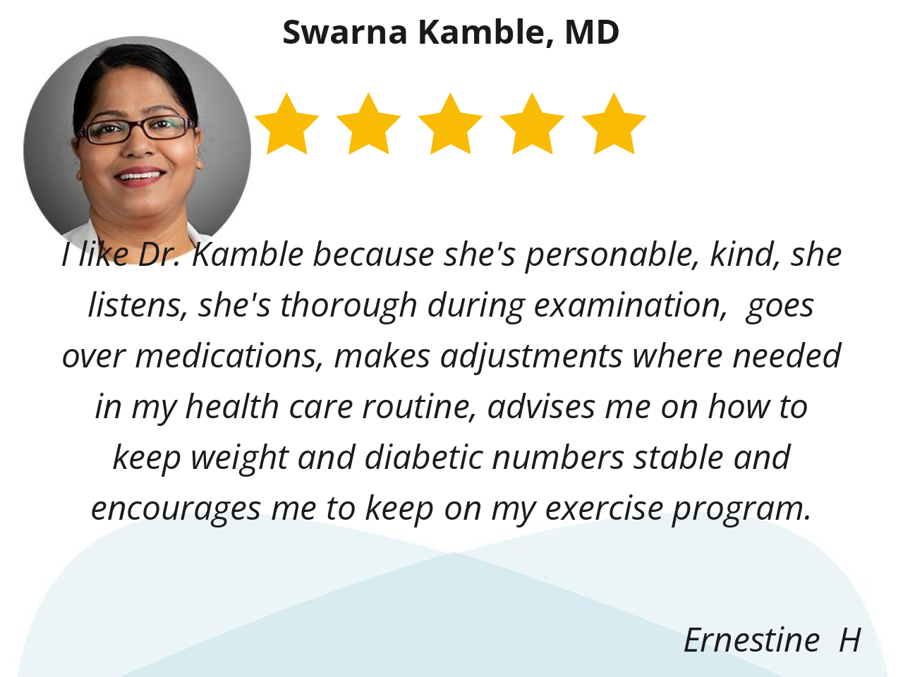 I like Dr. Kamble because she's personable, kind, she listens, she's thorough during examination, goes over medications, makes adjustments where needed in my health care routine, advises me on how to keep weight and diabetic numbers stable and encourages me to keep on my exercise program.
