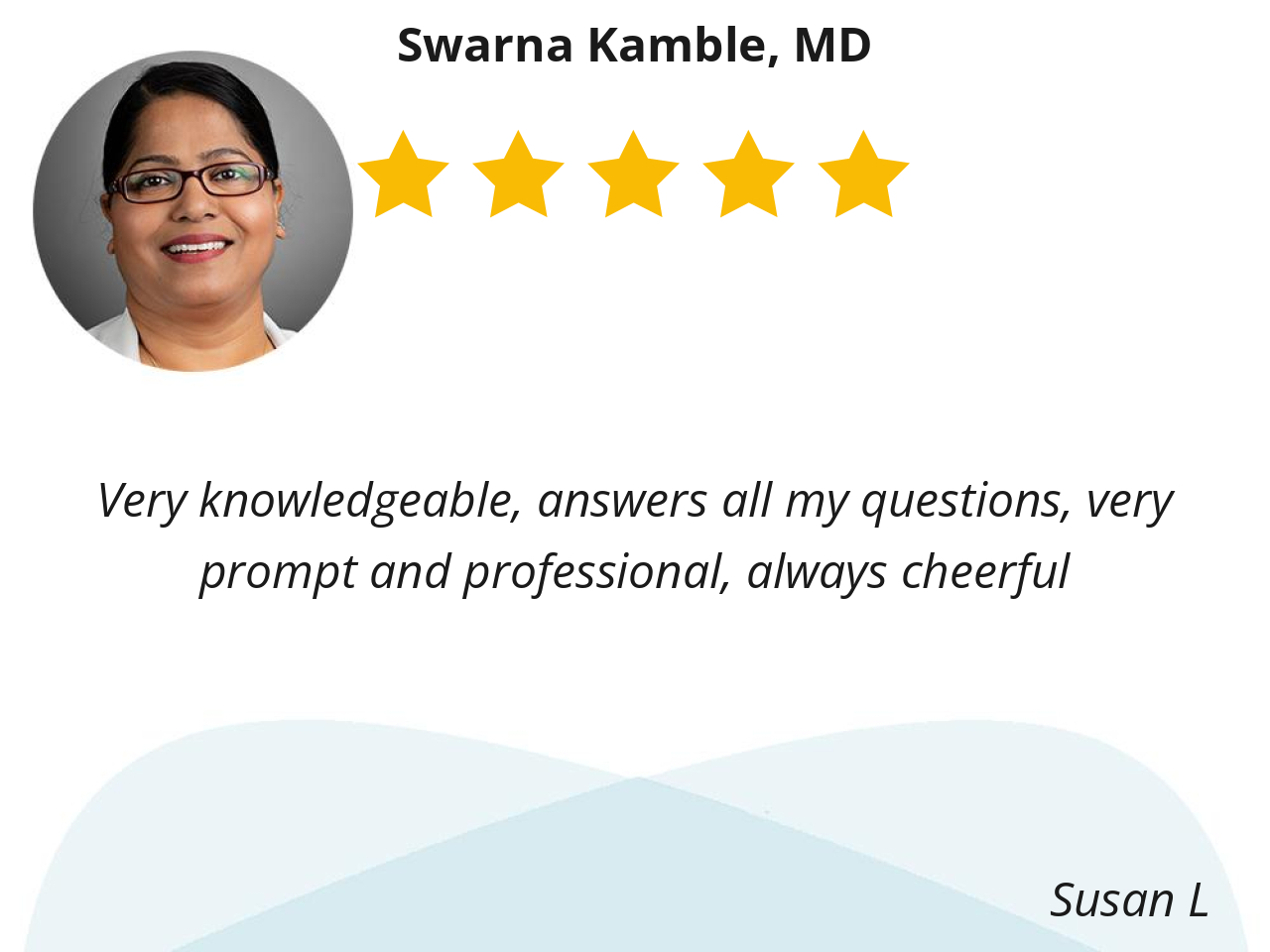 I like Swarma Kamble because she’s attentive to my needs and wants the best for me. She allows time for questions and provides practical guidance.