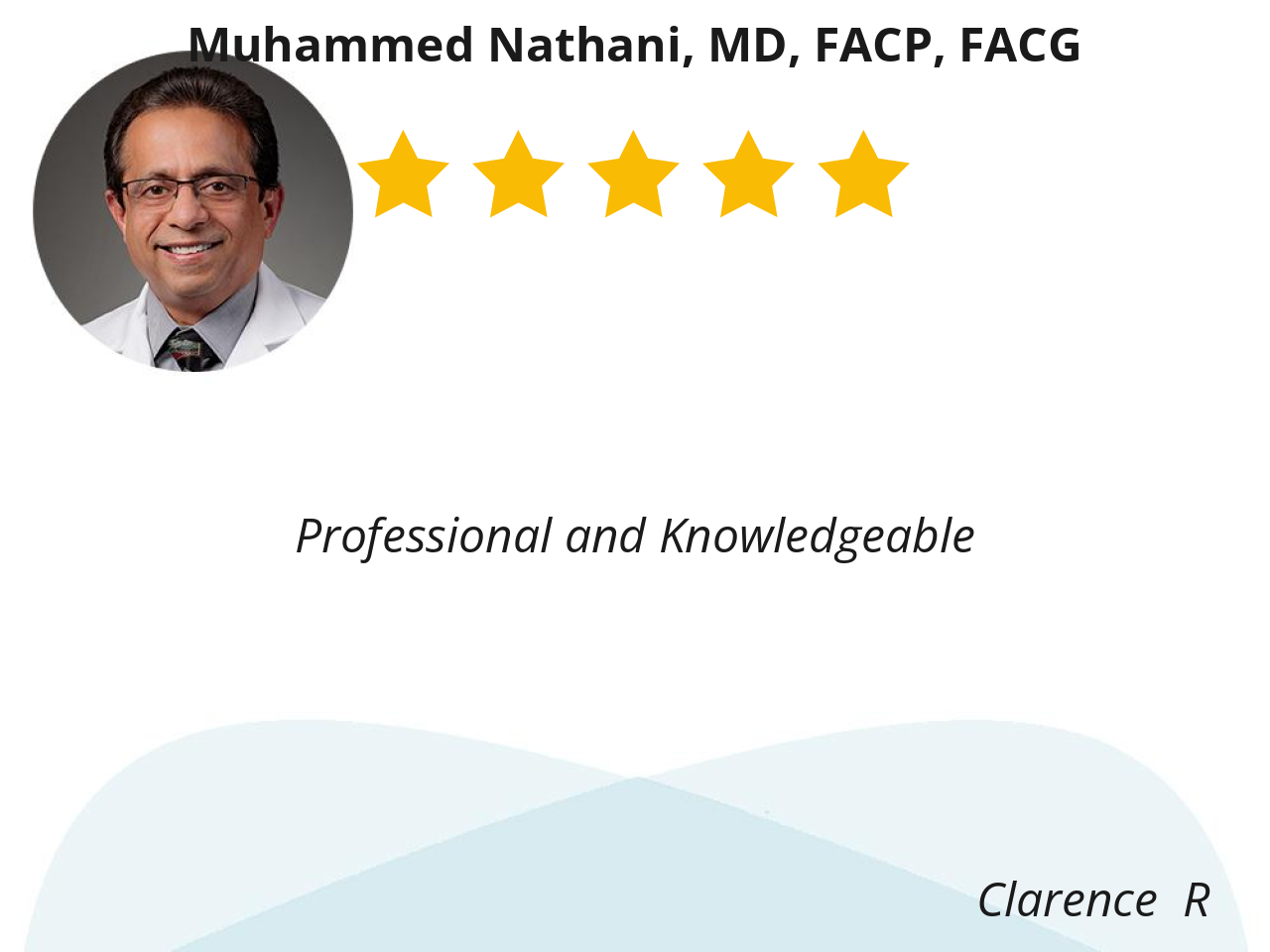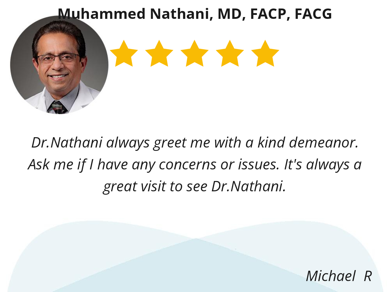 Dr Nathani very professional and kind. He has such a gentle manner and illuminating personality. Dr. Nathani is excellent In his discipline ; specialty of Gastroenterolgy. He is simply the best!! My gratitude is like the stars so vast. I am so thrilled to be in Dr. Nathani's care!!