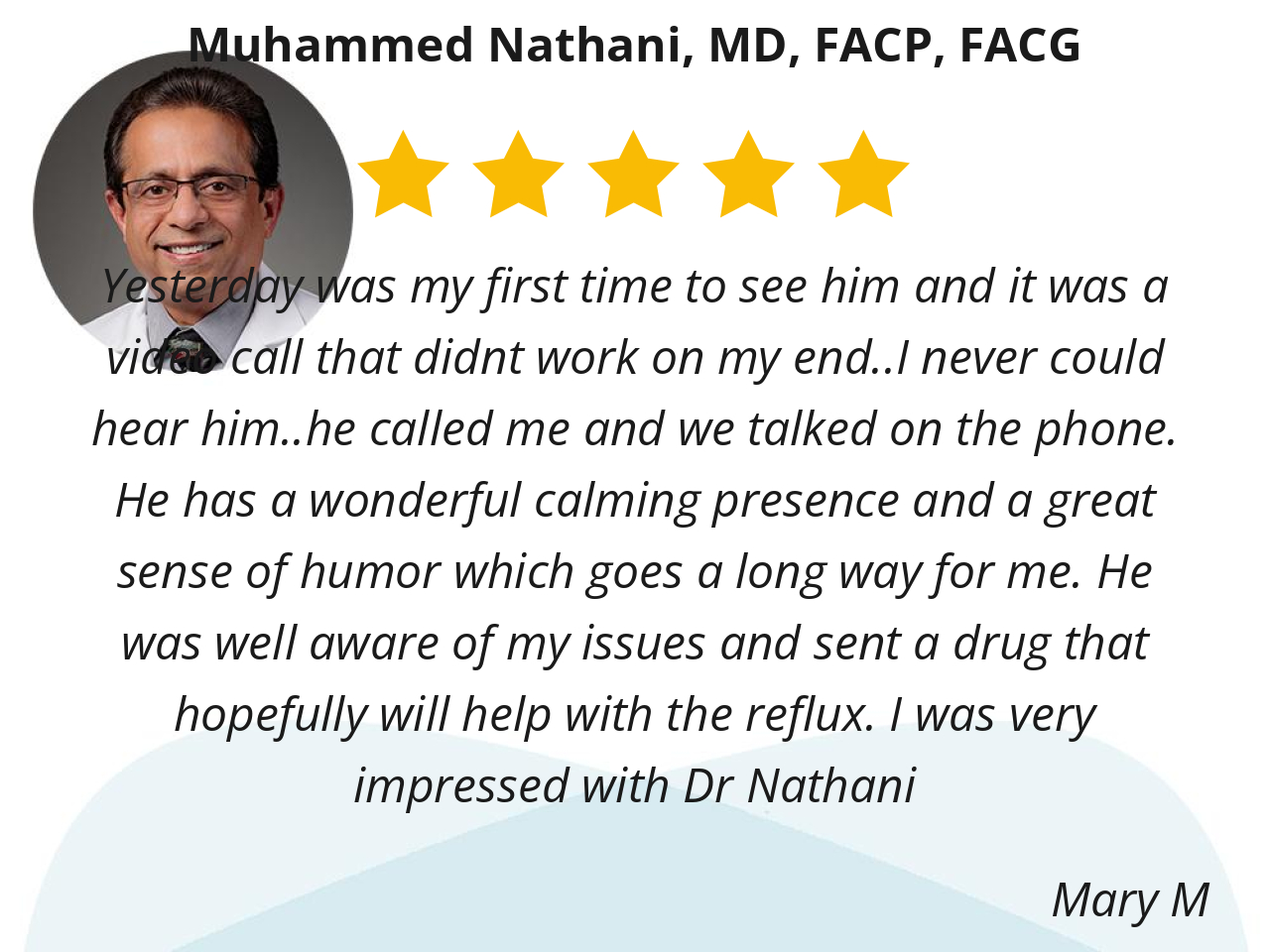 Yesterday was my first time to see him and it was a video call that didnt work on my end..I never could hear him..he called me and we talked on the phone. He has a wonderful calming presence and a great sense of humor which goes a long way for me. He was well aware of my issues and sent a drug that hopefully will help with the reflux. I was very impressed with Dr Nathani