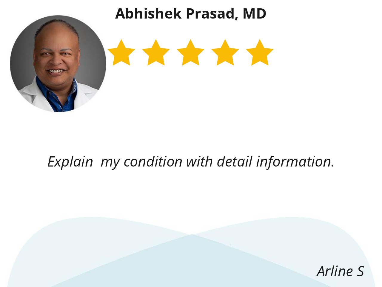 Dr. Prasad is professional and extremely knowledgeable. Dr. Prasad is very thorough, he really listens to his patients and I appreciate him for answering my many questions. He found my cancer early and continues to make sure I stay healthy. I know I can be difficult when it comes to test and he is always patient with me and talks me through everything. I could write pages about him.
