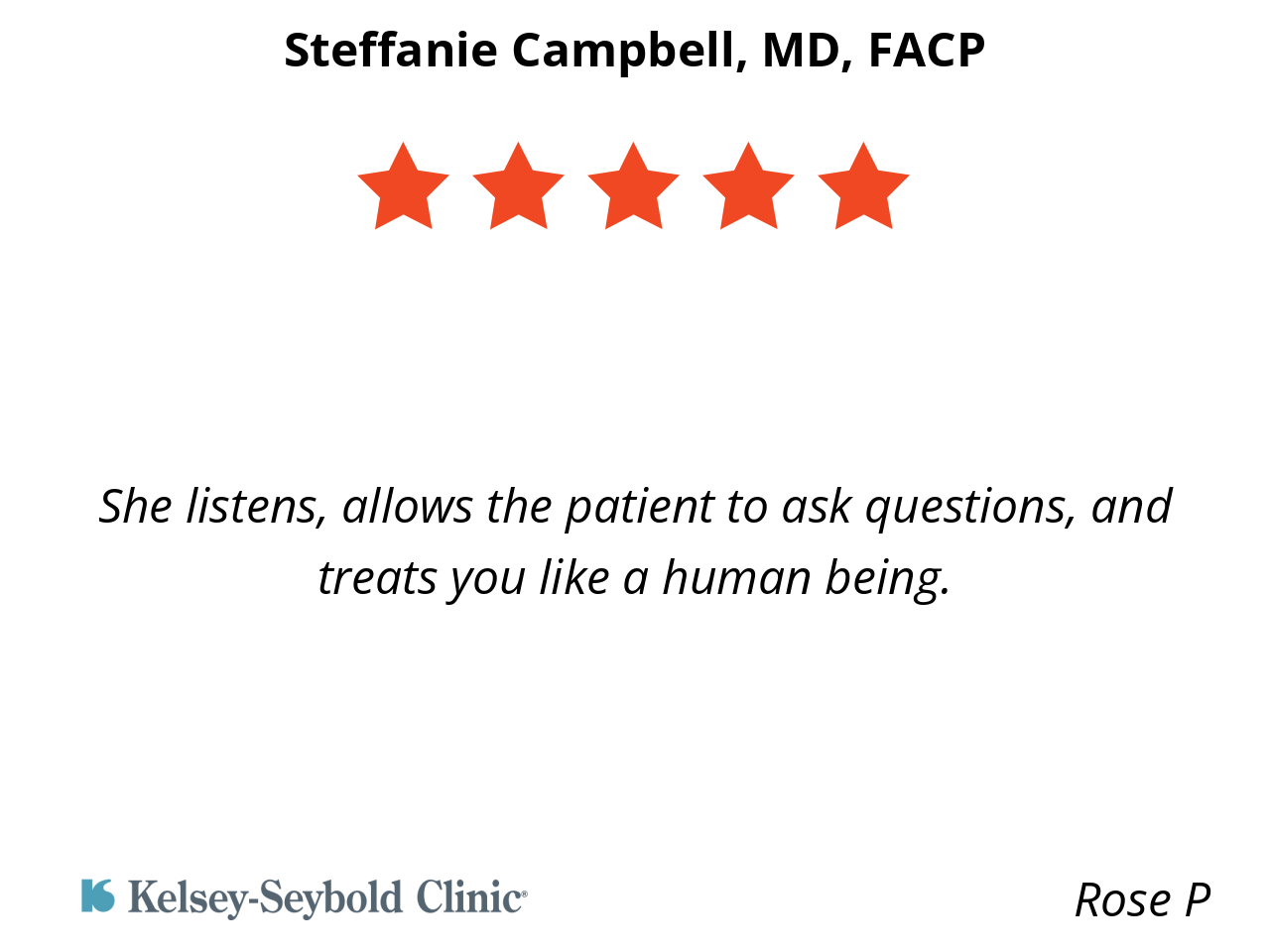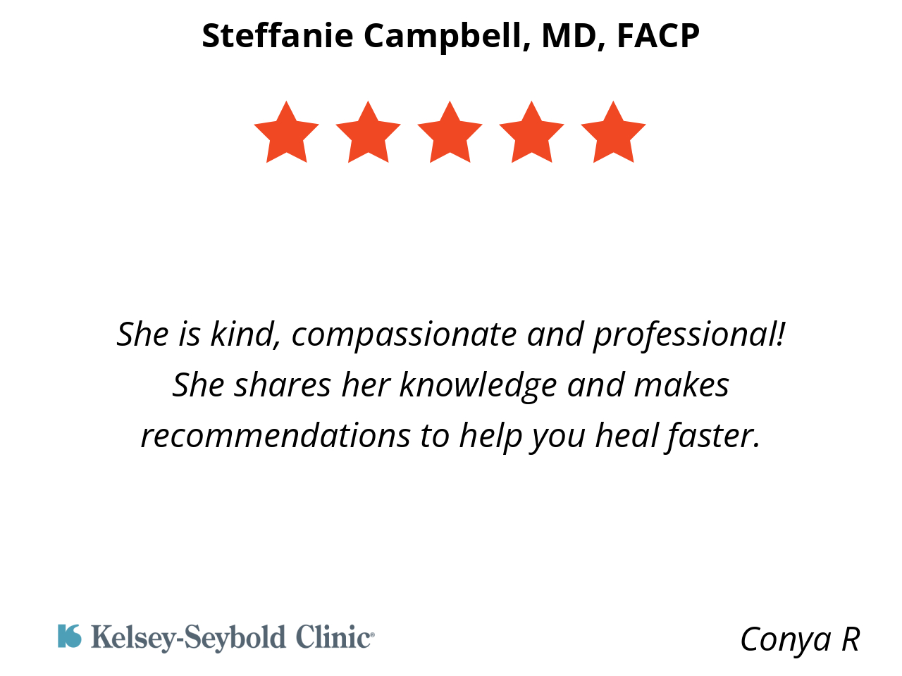 Dr. Campbell is a very caring, very professional. When I have a questions about my illness, she explained very clear and make you feel comforter. She is a very amazing doctor. Dr. Campbell provide a wonderful care. Have a lovely combination of professionalism and caring. I am really lucky to have her as my doctor.
