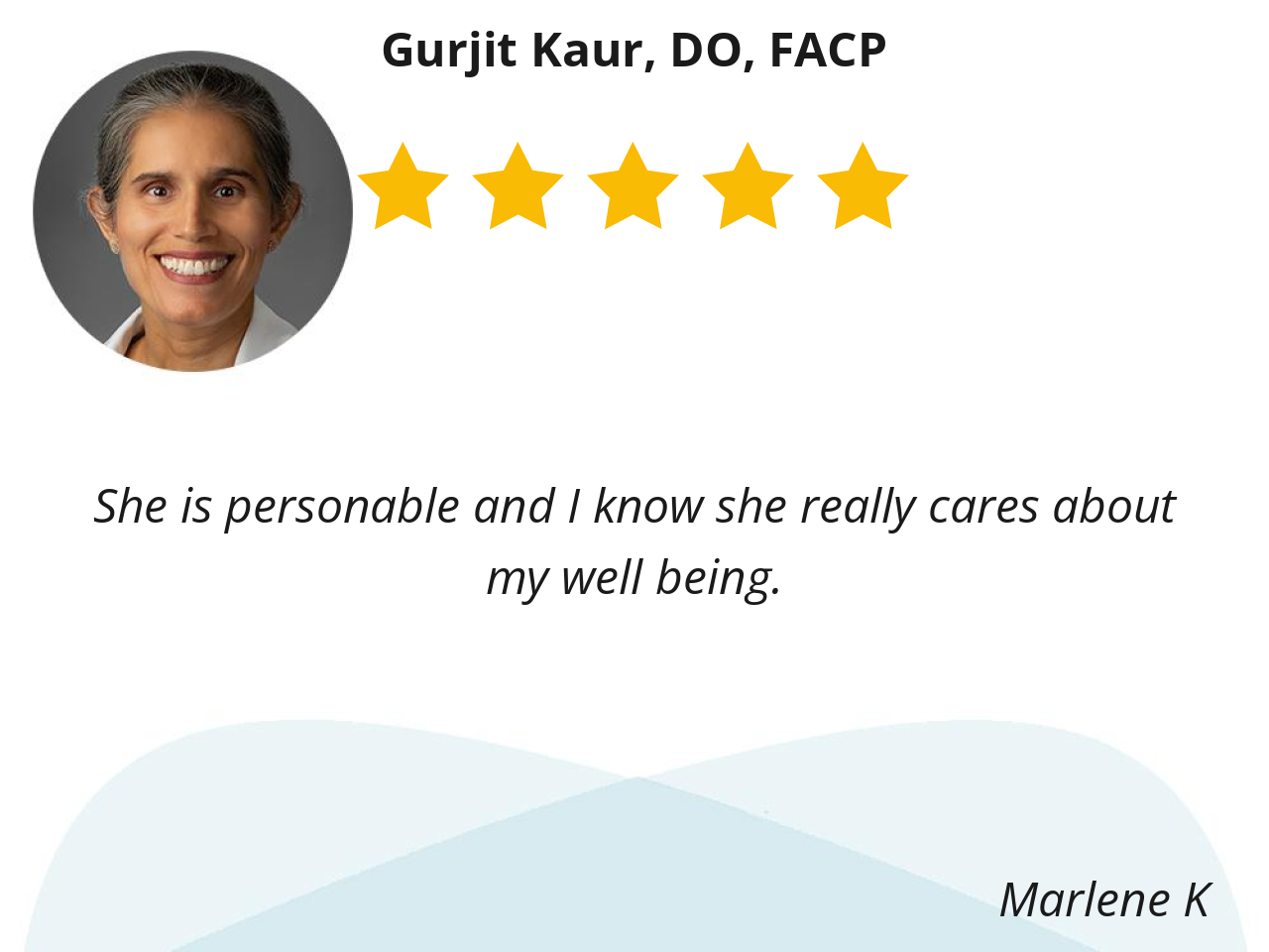 Dr. Kaur has always been gracious, kind and patient to listen to my concerns and answers questions when I need information. She genuinely provides care to her patients and puts them at ease.