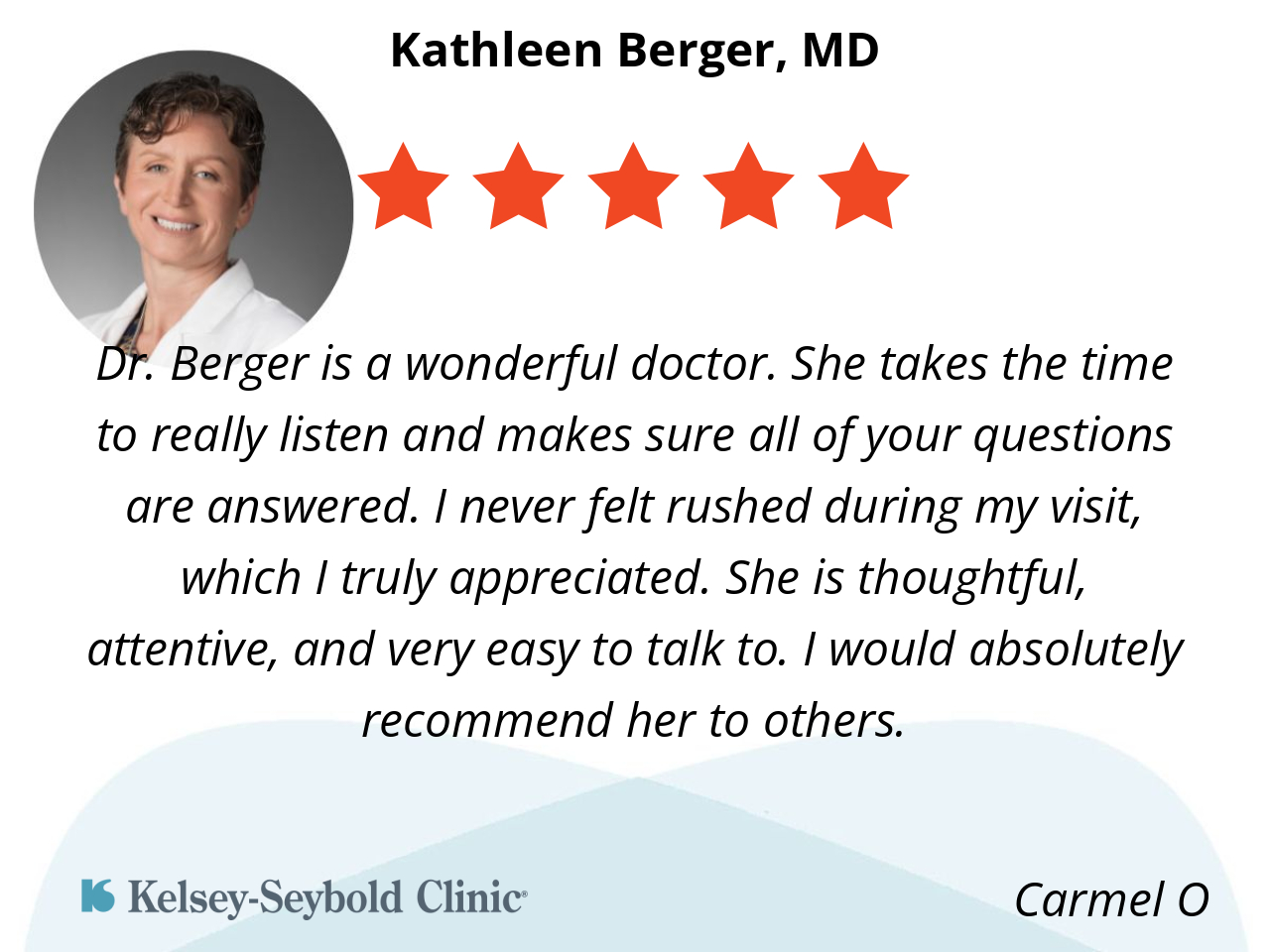 Dr. Berger is a wonderful doctor. She takes the time to really listen and makes sure all of your questions are answered. I never felt rushed during my visit, which I truly appreciated. She is thoughtful, attentive, and very easy to talk to. I would absolutely recommend her to others.