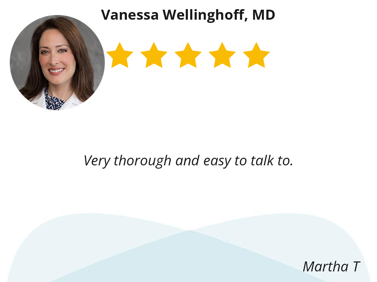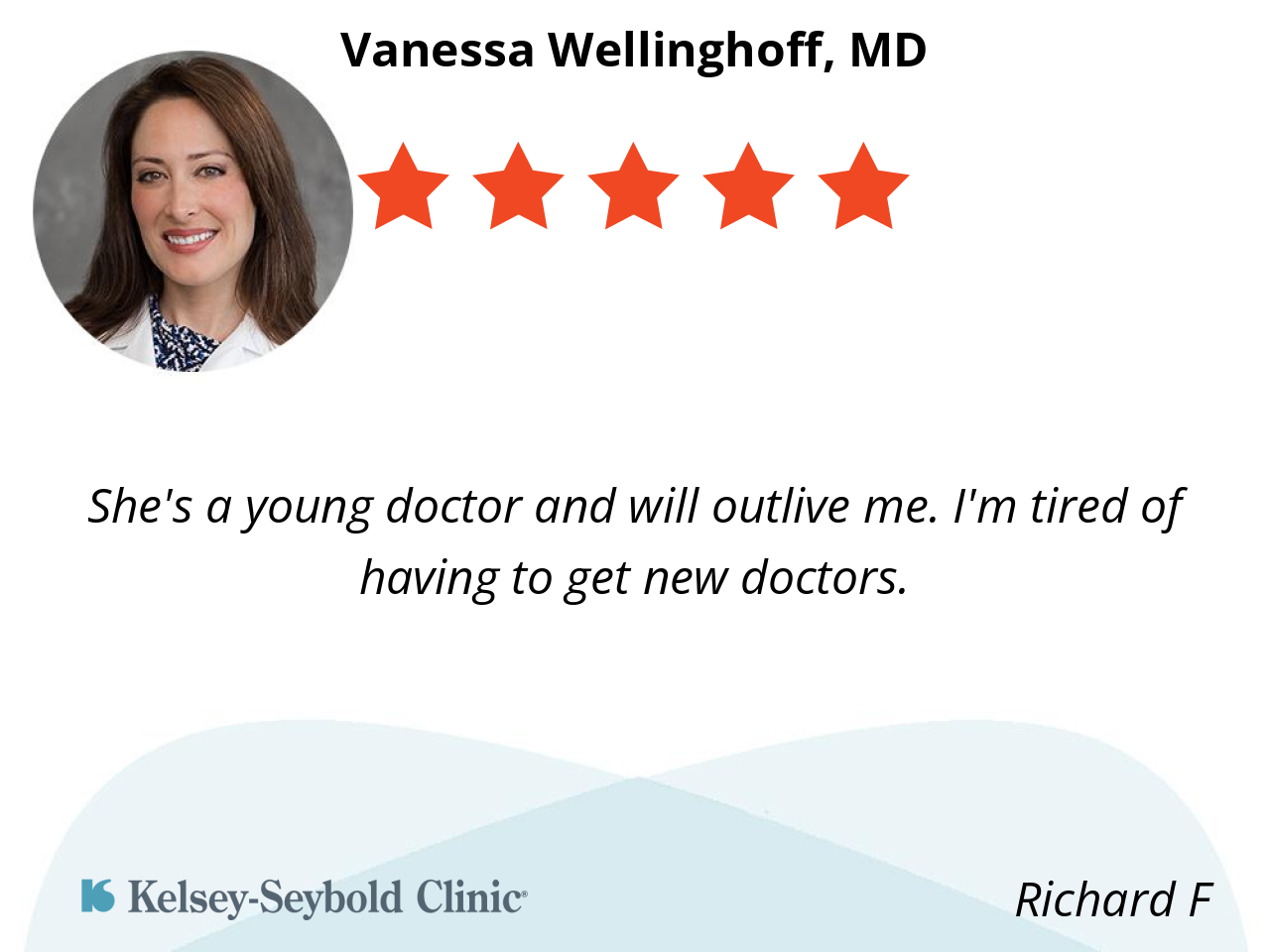 Dr Wellinghoff is thorough, detailed, and helpful to me in managing my health care. She answers my questions in a timely manner. She directs me to specialists when needed. I have enjoyed my relationship with Dr Wellinghoff over the years.