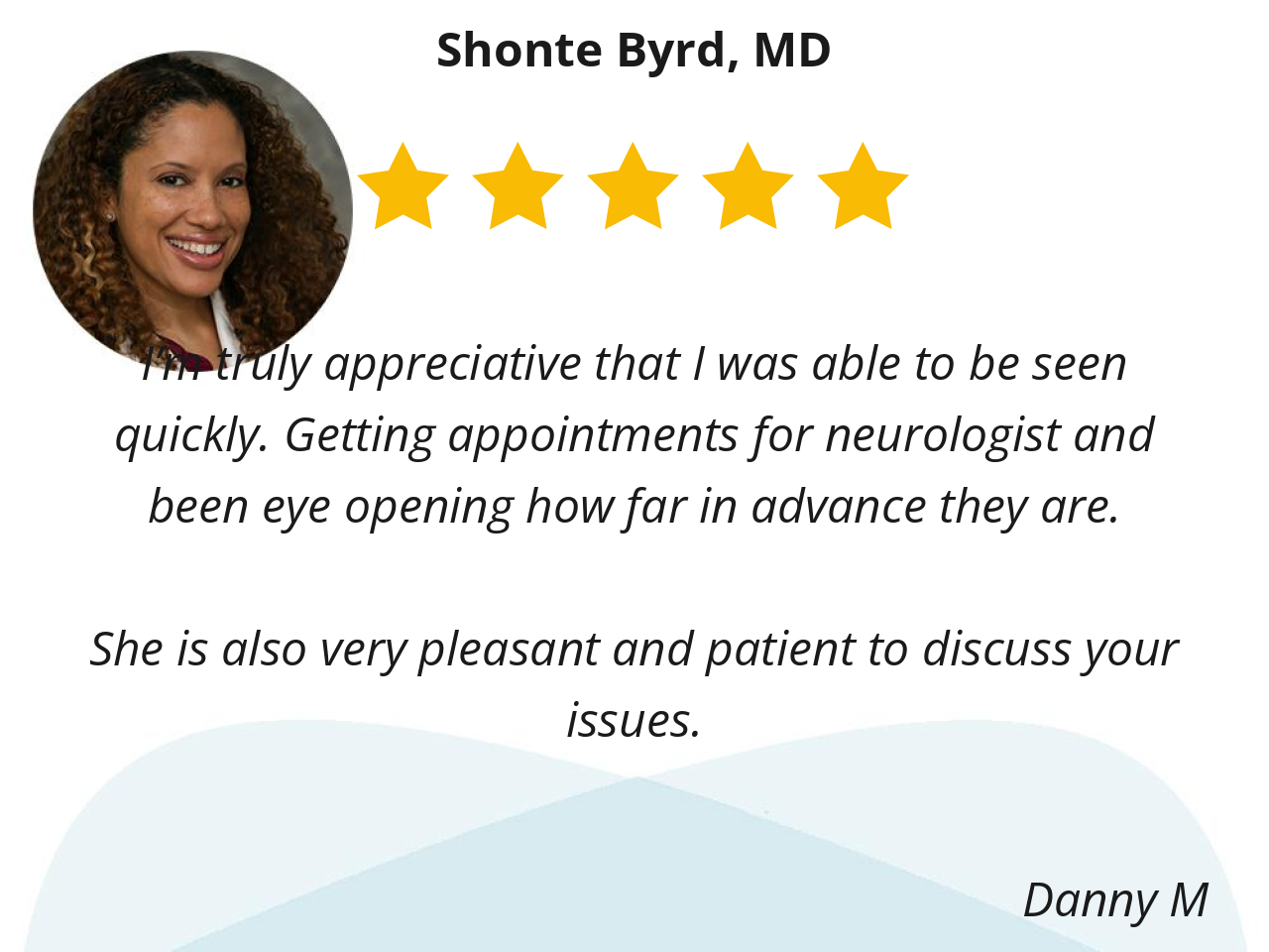 Thank you Dr.Bryd! I’m going to refer you to my family and friends looking for a knowledgeable, confident neurologist.