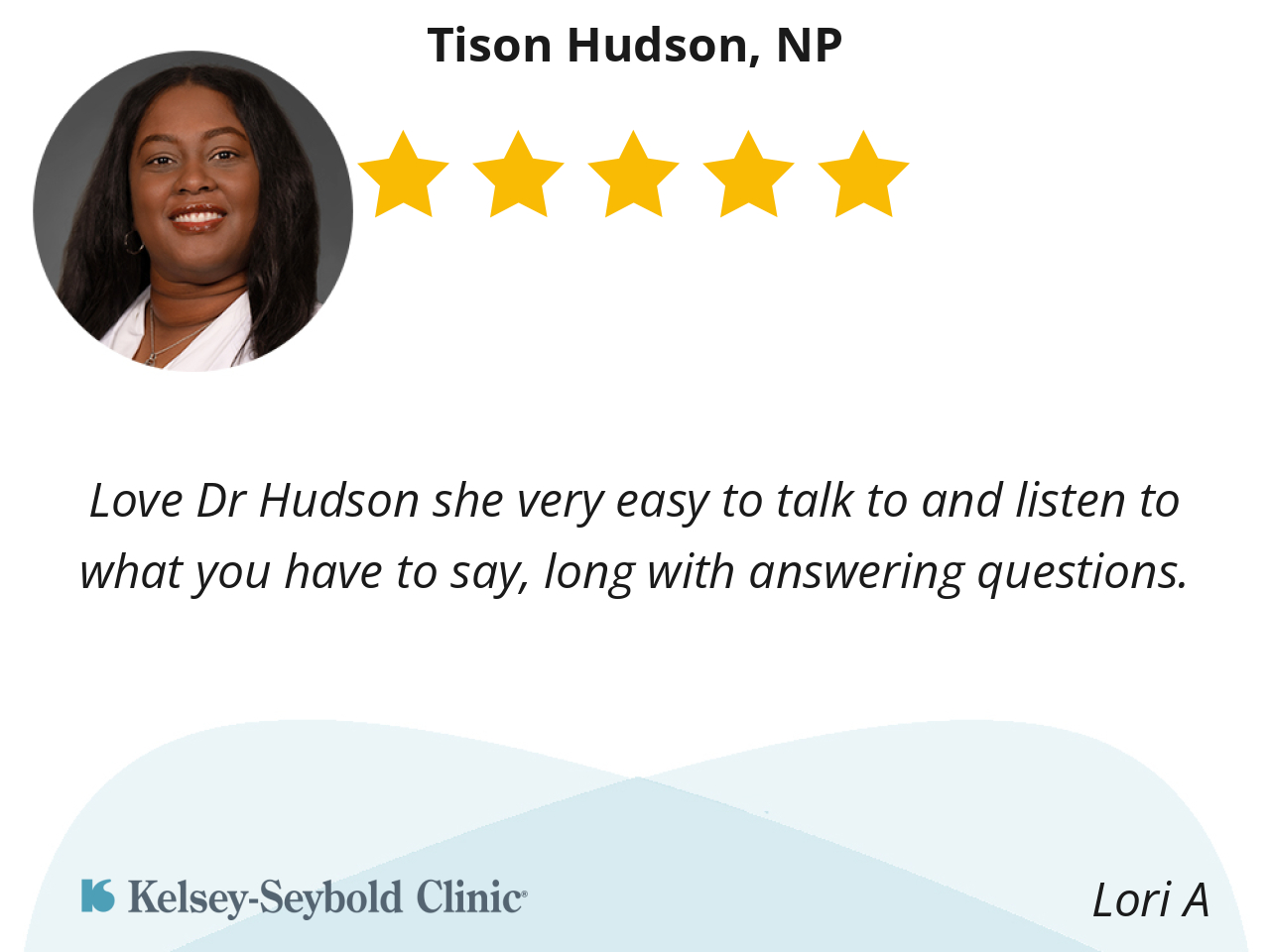 Love Dr Hudson she very easy to talk to and listen to what you have to say, long with answering questions.