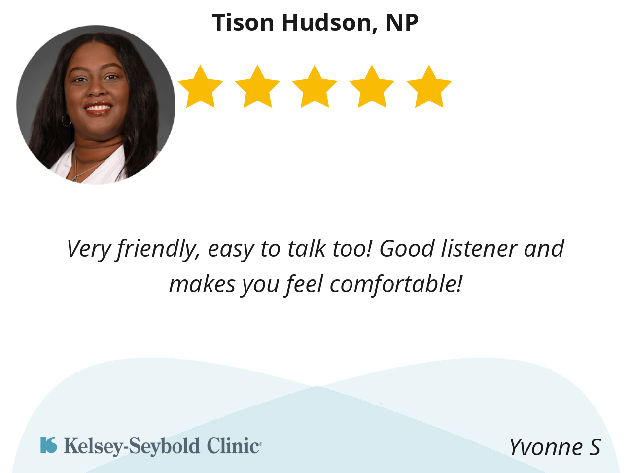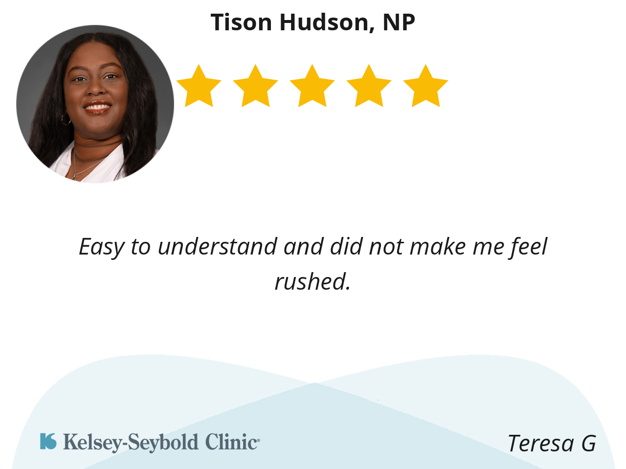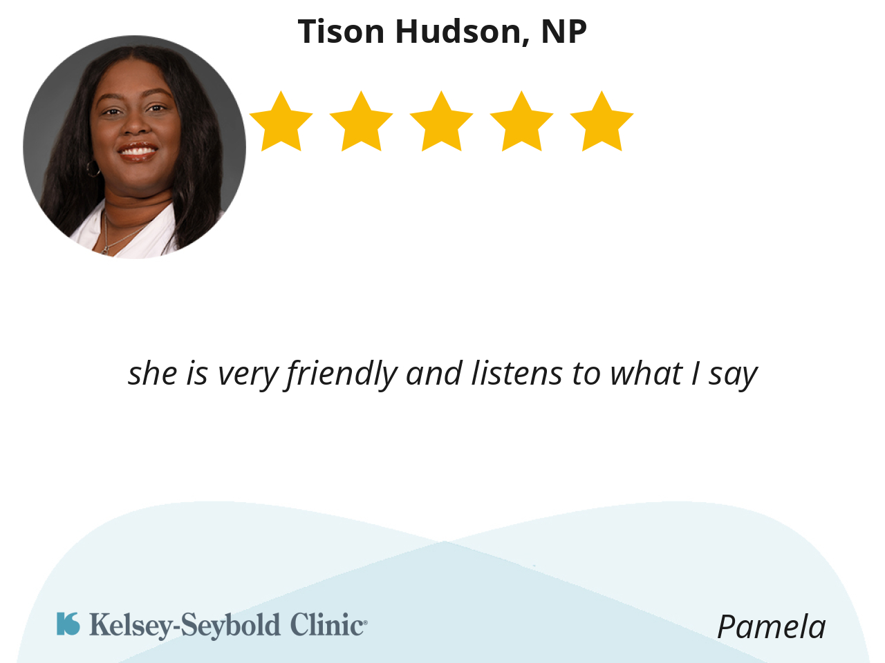 NP Hudson took her time to listen to me. She was very antative to my needs to make sure that I got all my questions answered and got the medical attention I needed.