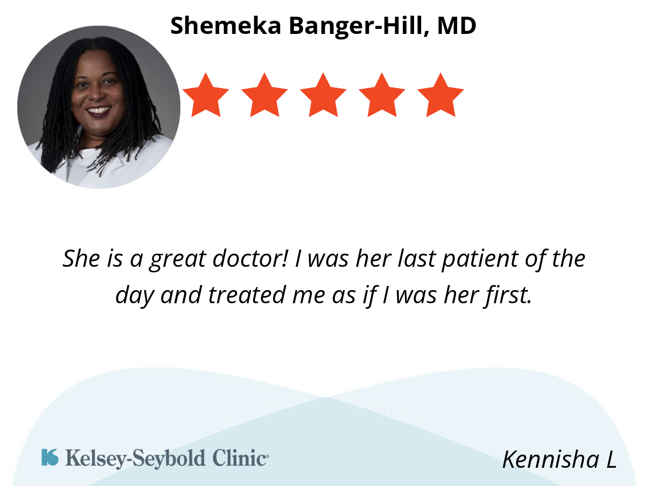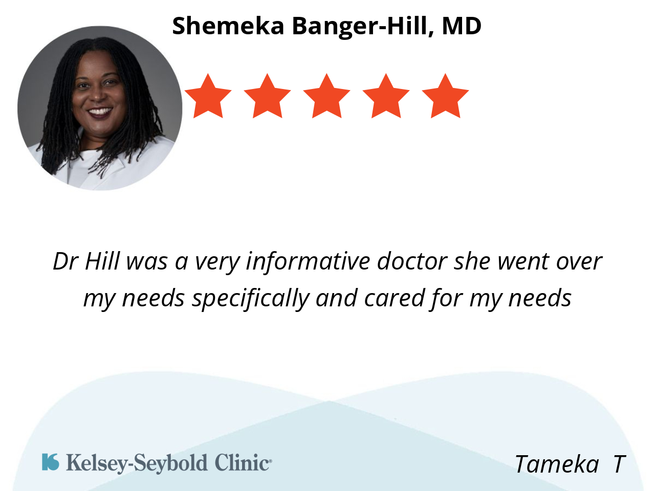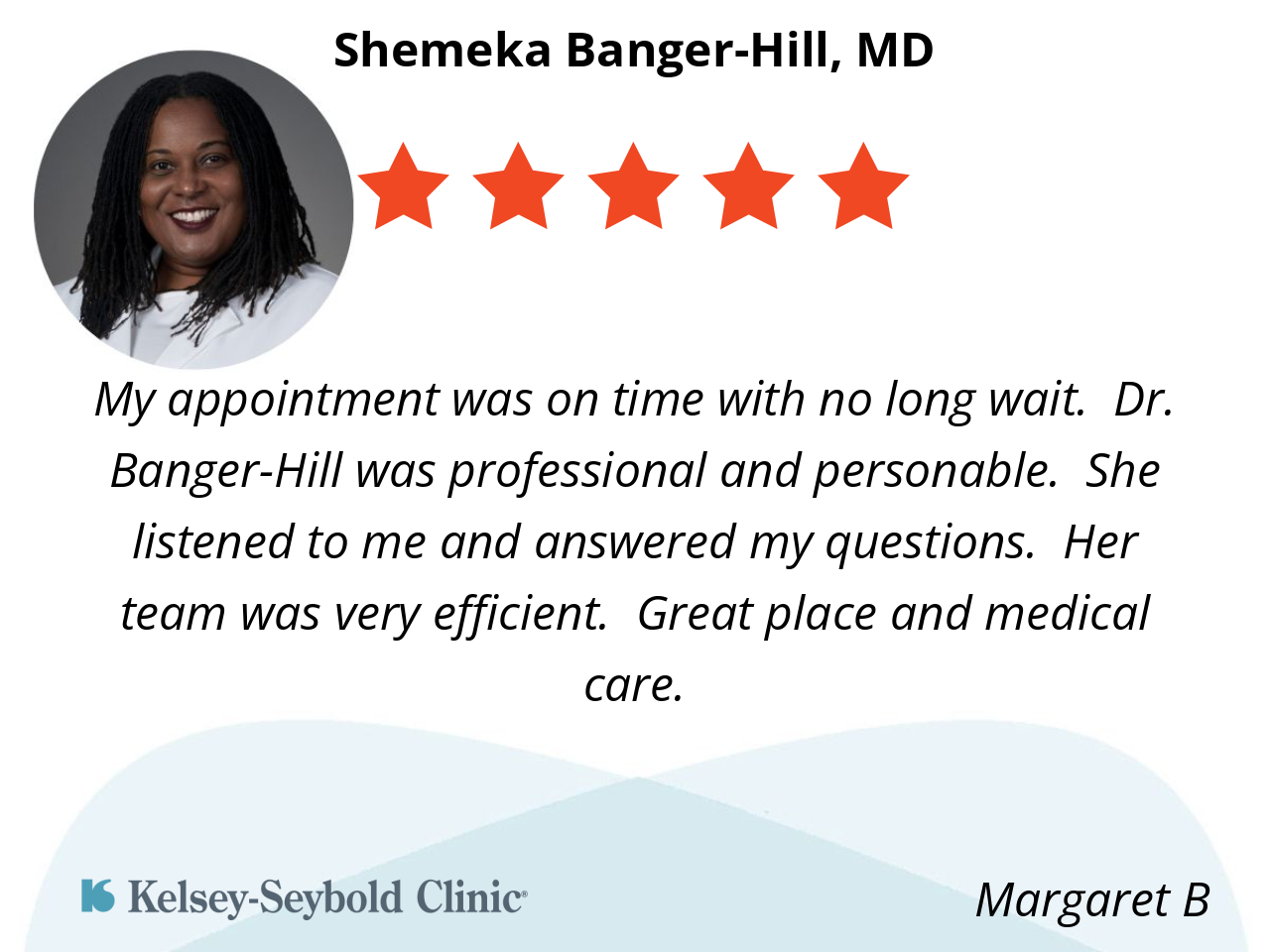 My appointment was on time with no long wait. Dr. Banger-Hill was professional and personable. She listened to me and answered my questions. Her team was very efficient. Great place and medical care.