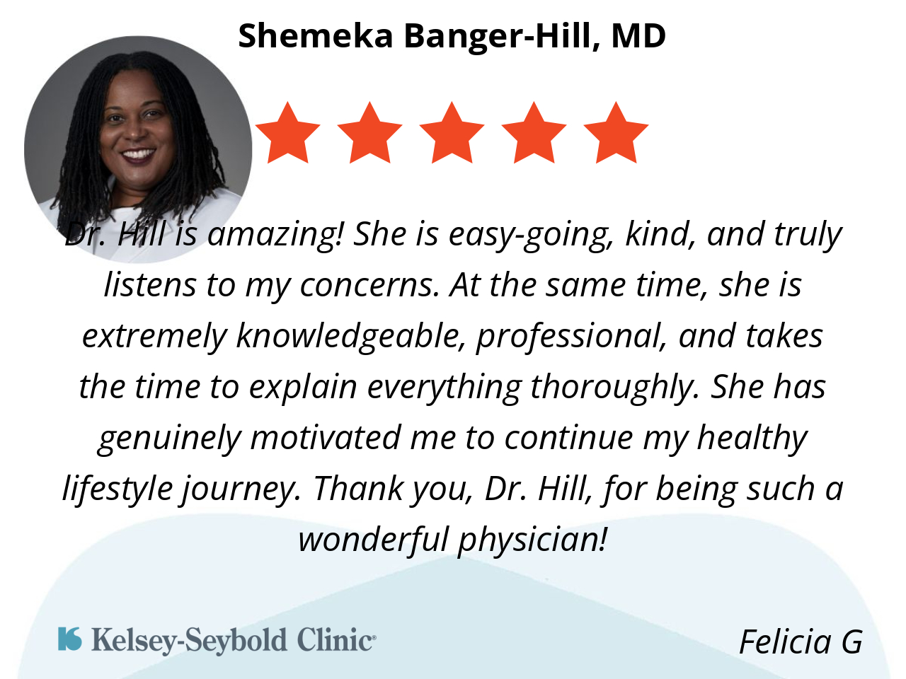 Dr. Hill is amazing! She is easy-going, kind, and truly listens to my concerns. At the same time, she is extremely knowledgeable, professional, and takes the time to explain everything thoroughly. She has genuinely motivated me to continue my healthy lifestyle journey. Thank you, Dr. Hill, for being such a wonderful physician!