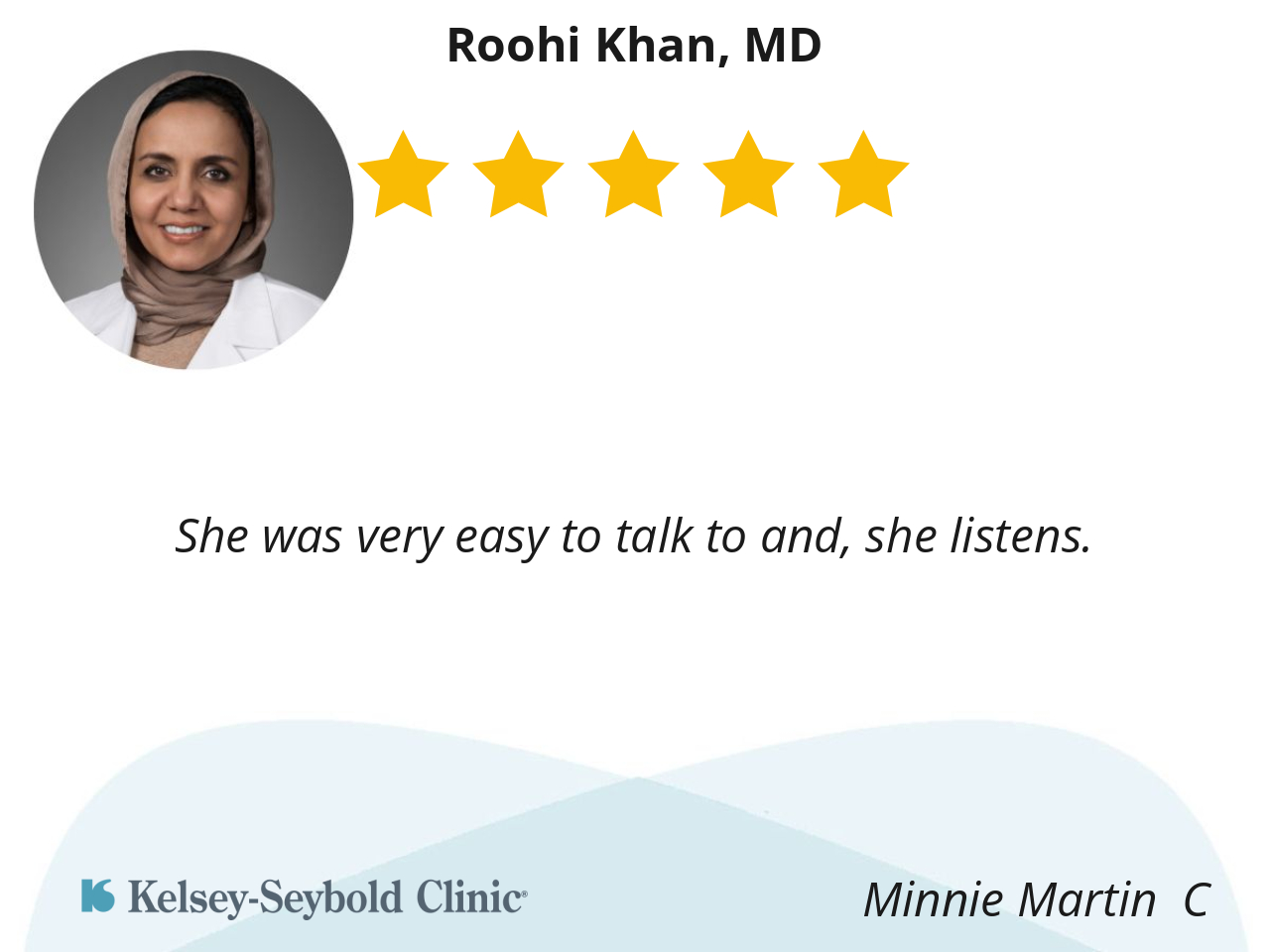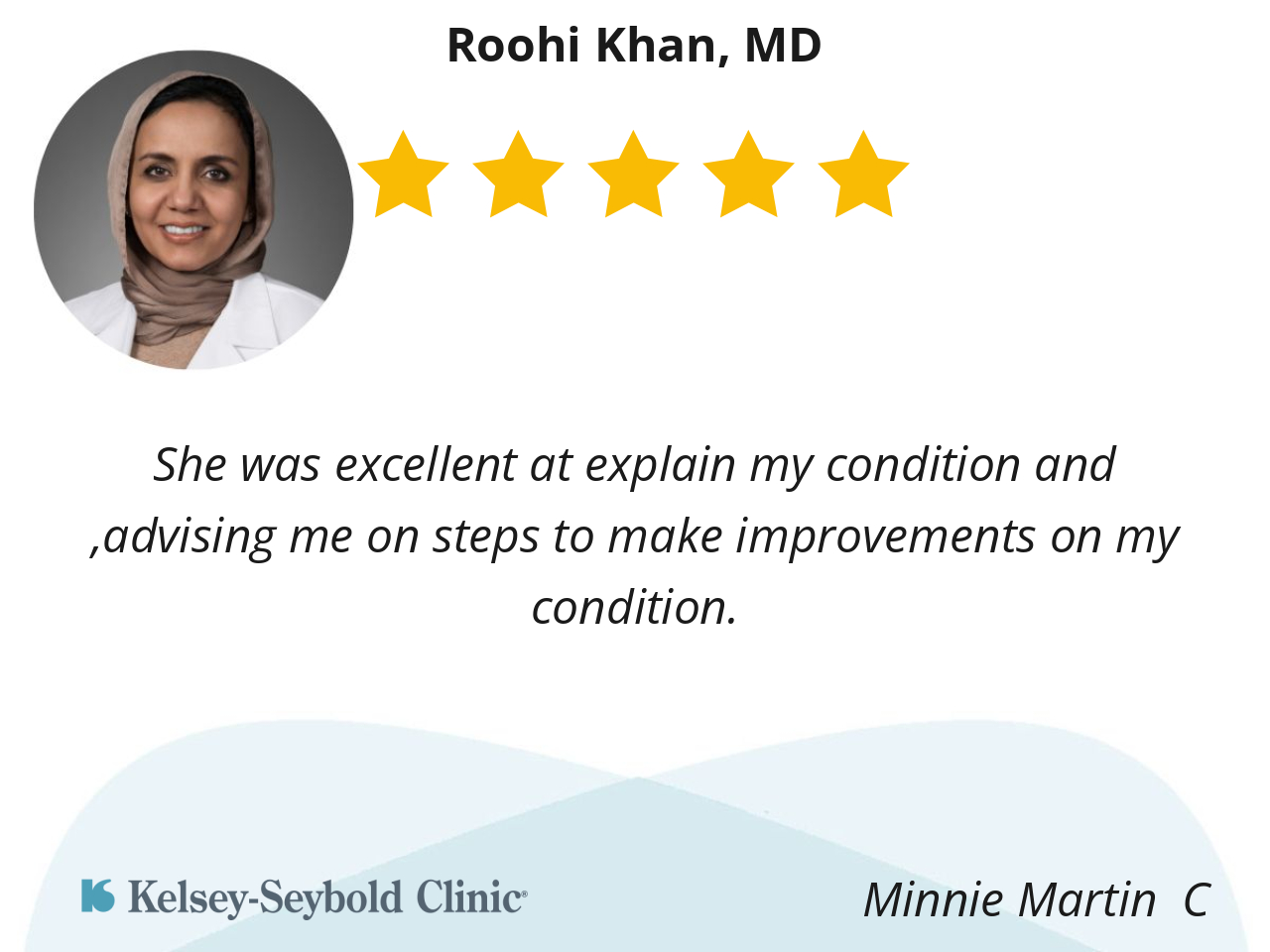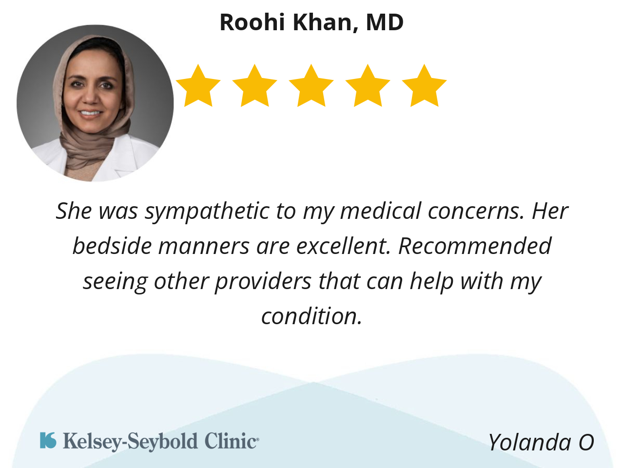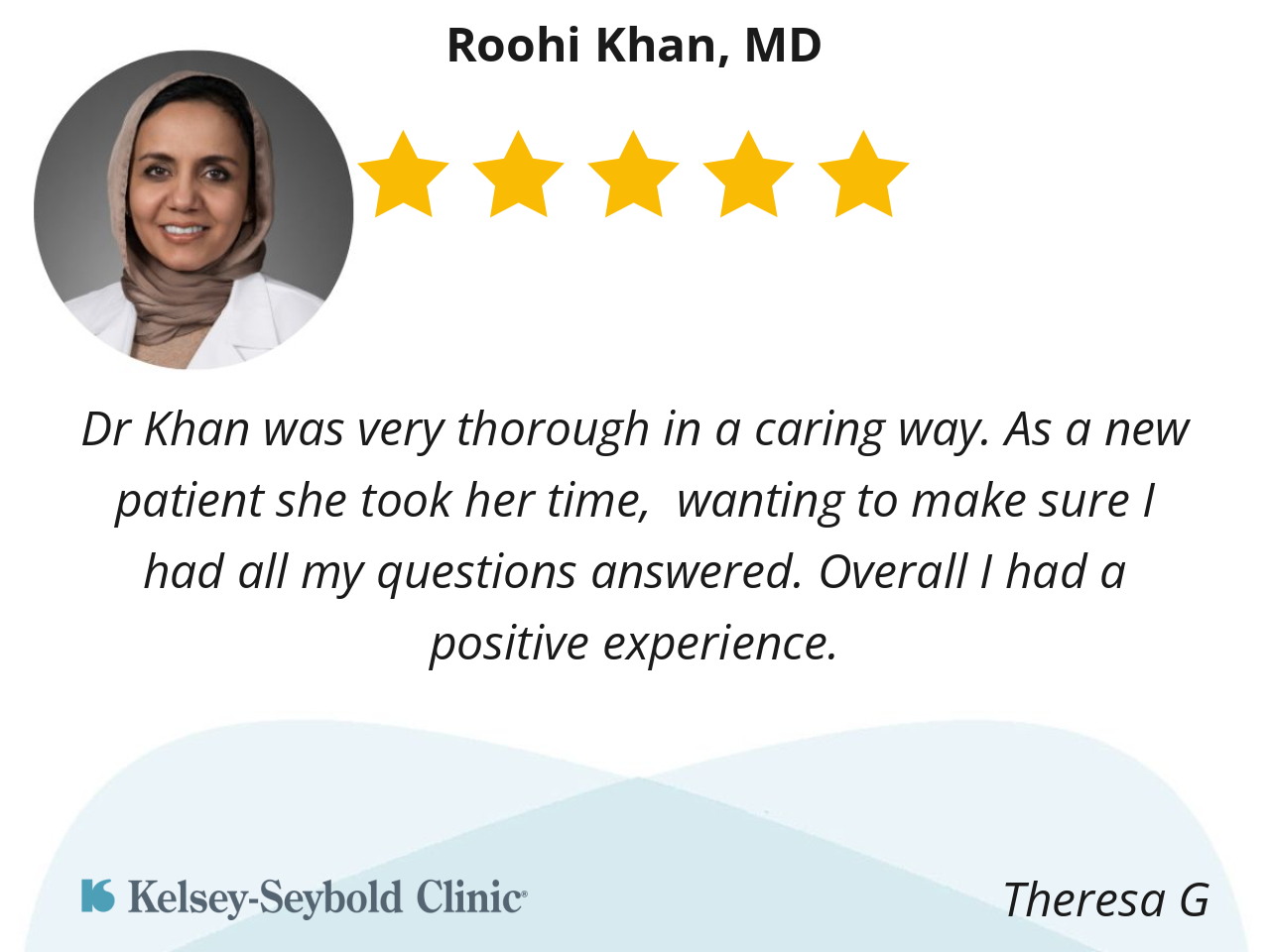 Dr Khan was very thorough in a caring way. As a new patient she took her time, wanting to make sure I had all my questions answered. Overall I had a positive experience.