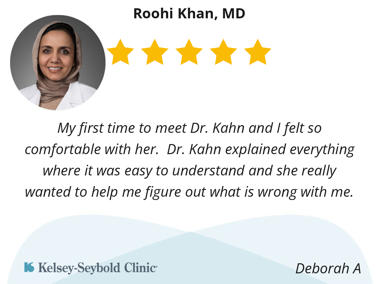 My first time to meet Dr. Kahn and I felt so comfortable with her. Dr. Kahn explained everything where it was easy to understand and she really wanted to help me figure out what is wrong with me.