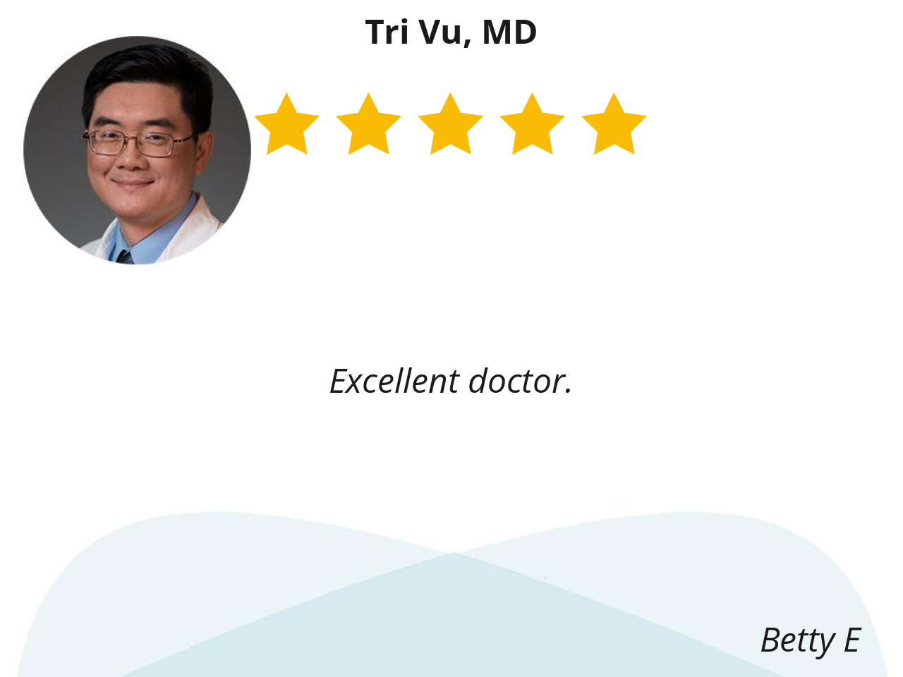 Dr Tri Vu was very supportive, friendly, compassionate, and encouraging. He filled me with great information about my condition. I felt at ease with him. He was polite, humorous and patient answering my concerns. Great service.