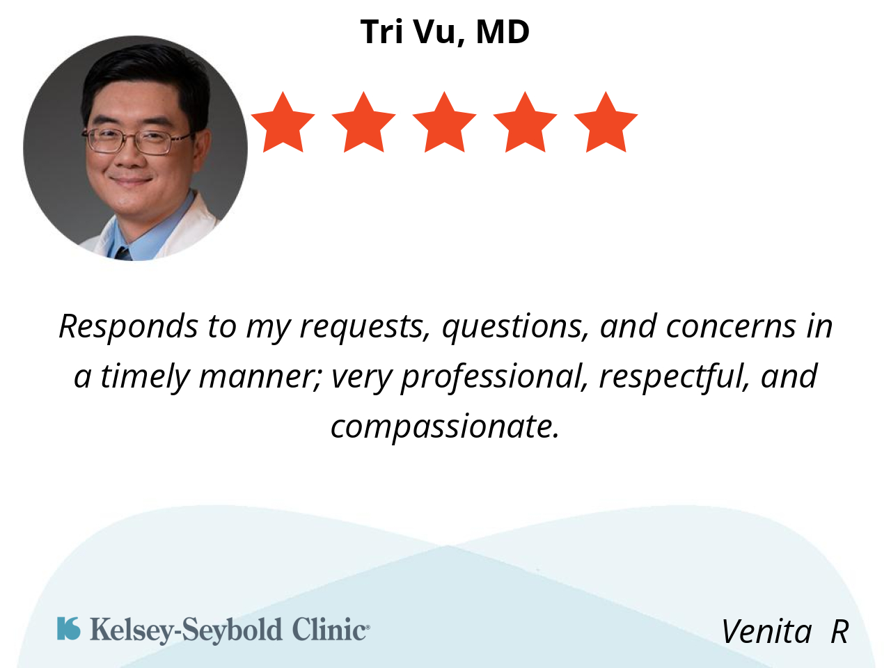 Doctor Vu has most likely saved my life. Words cannot express my gratitude. Doctor Vu represents Kelsey Seybold in a most favorable manner.