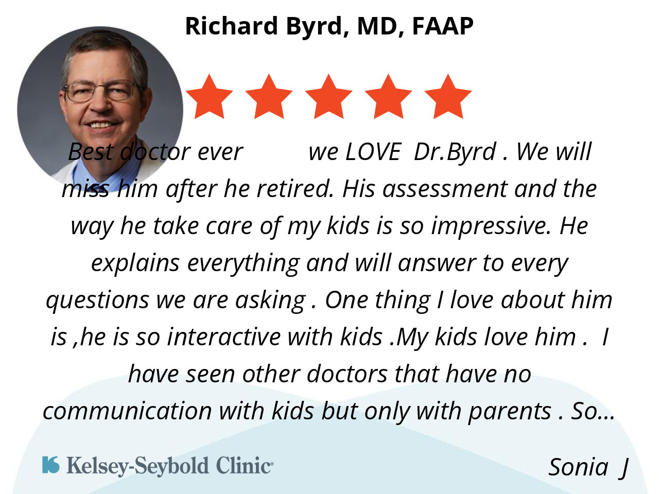 Best doctor ever ❤️❤️we LOVE Dr.Byrd . We will miss him after he retired. His assessment and the way he take care of my kids is so impressive. He explains everything and will answer to every questions we are asking . One thing I love about him is ,he is so interactive with kids .My kids love him . I have seen other doctors that have no communication with kids but only with parents . So overall Dr.Byrd is the BEST . ❤️