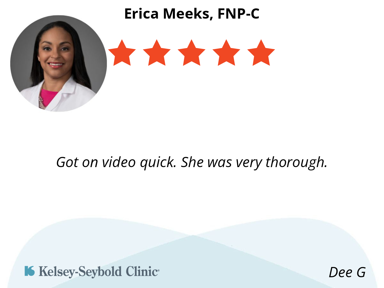 Dr. Meeks was very attentive during my E-Visit and addressed my concerns thoroughly. I appreciated how prompt and clear her responses were.