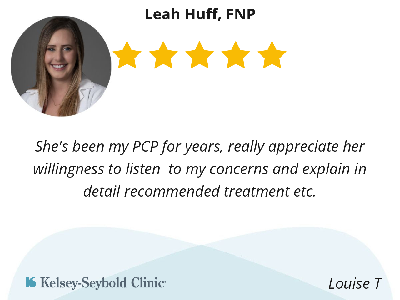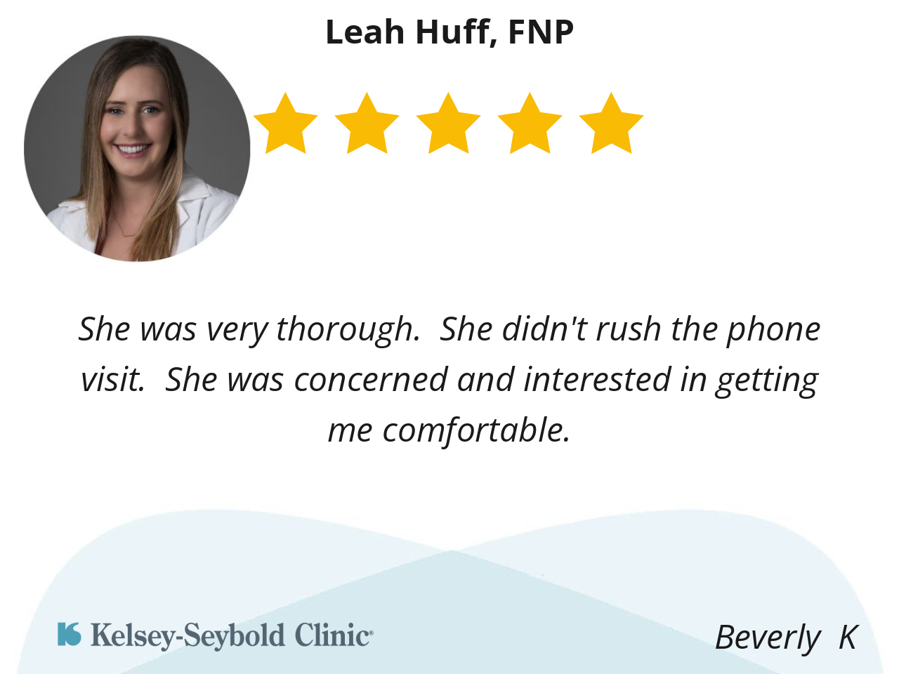 Leah Huff, LNP and her nurse was so nice and tentative. They listened and answer all my questions. Compassion and Kindness is key and that is what they both are! This was my firs time to this location and I will be returning!