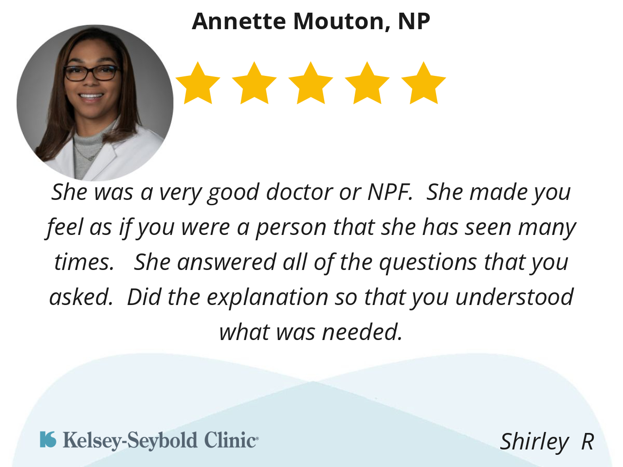 She was a very good doctor or NPF. She made you feel as if you were a person that she has seen many times. She answered all of the questions that you asked. Did the explanation so that you understood what was needed.