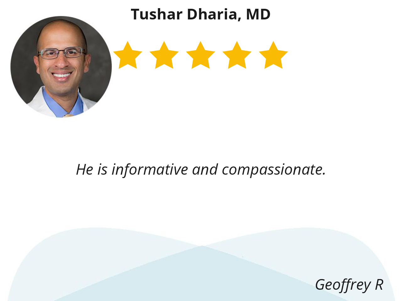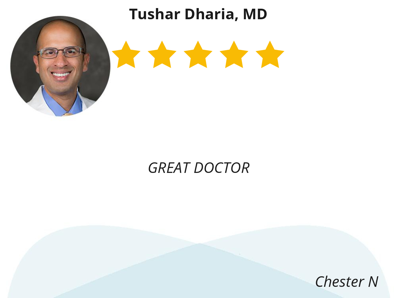 I appreciate Dr. Dharia because he listens to my concern. Explains and understands questions that are being asked. It's great know he's a caring physician. He helped me not to be afraid of a