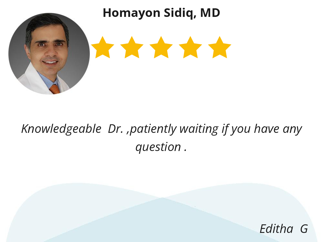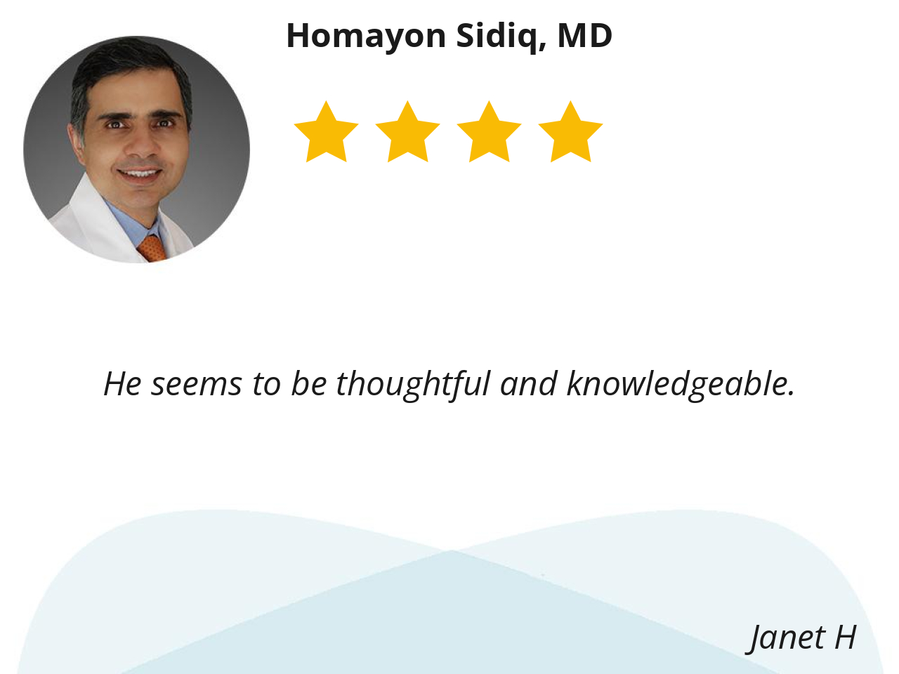 Dr. Sidiq is very direct and to the point. He listened, asked questions then came up with a plan for my issues.