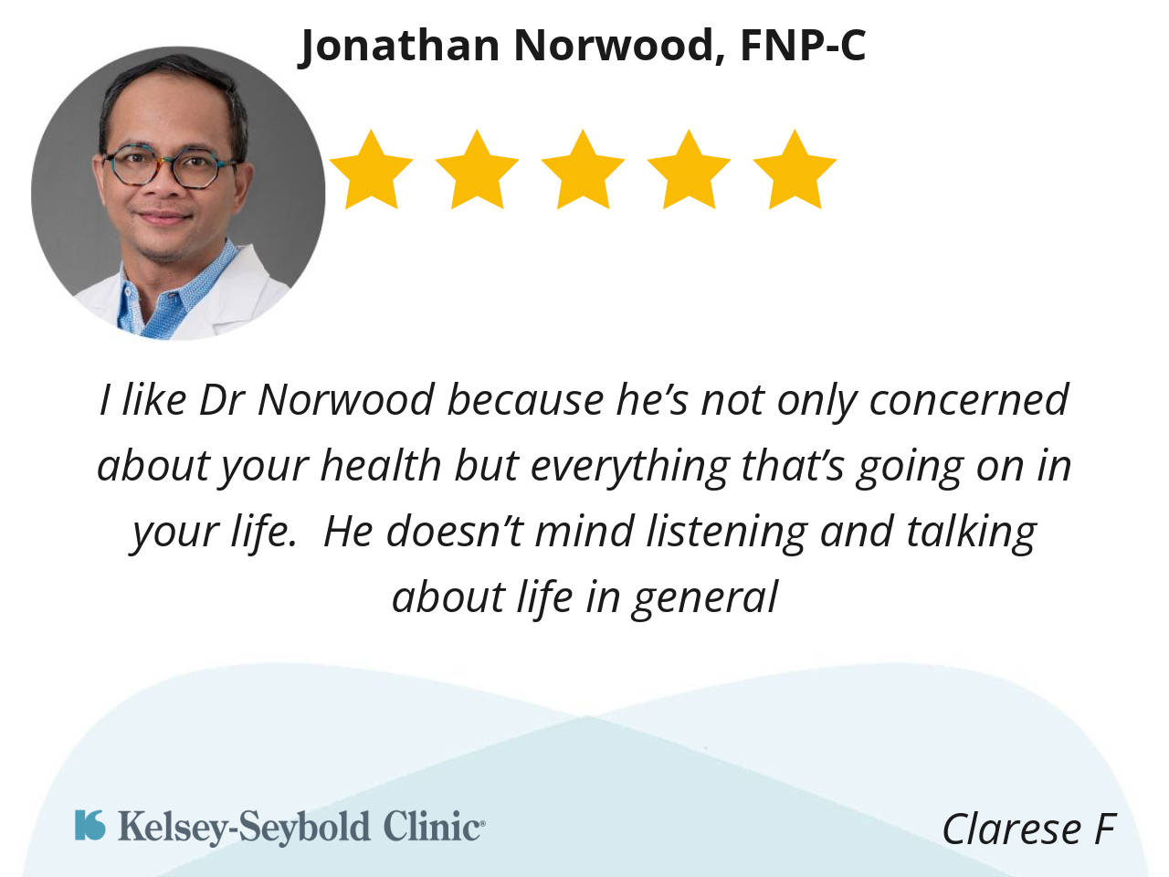 I like Dr Norwood because he’s not only concerned about your health but everything that’s going on in your life. He doesn’t mind listening and talking about life in general