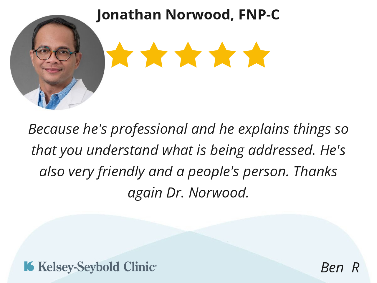Because he's professional and he explains things so that you understand what is being addressed. He's also very friendly and a people's person. Thanks again Dr. Norwood.