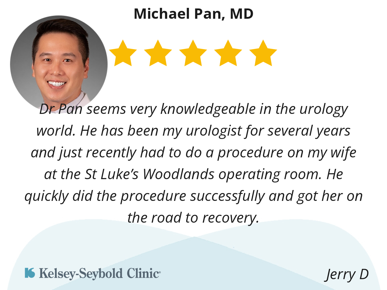 Dr Pan seems very knowledgeable in the urology world. He has been my urologist for several years and just recently had to do a procedure on my wife at the St Luke’s Woodlands operating room. He quickly did the procedure successfully and got her on the road to recovery.