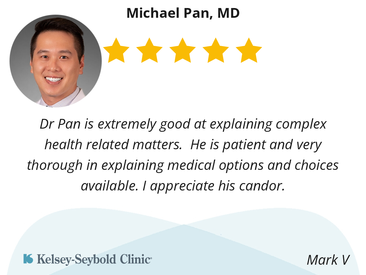 It was my first visit with Dr Michael Pan. I was very impressed with Dr Pan's responses to my questions. Very clear and answered my medical questions precisely. My confidence and satisfaction with Dr Pan is very high.