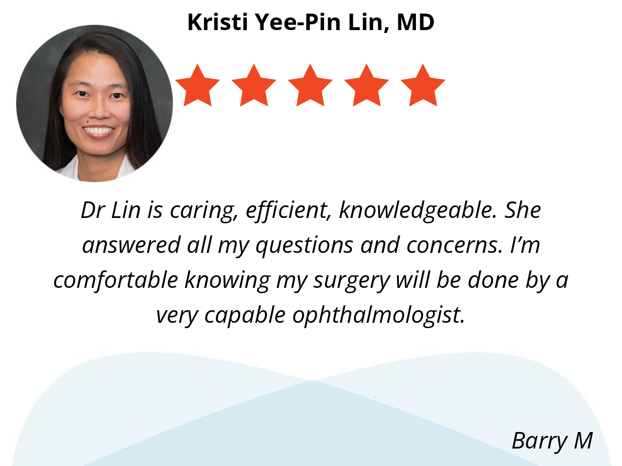 Dr Lin is caring, efficient, knowledgeable. She answered all my questions and concerns. I’m comfortable knowing my surgery will be done by a very capable ophthalmologist.