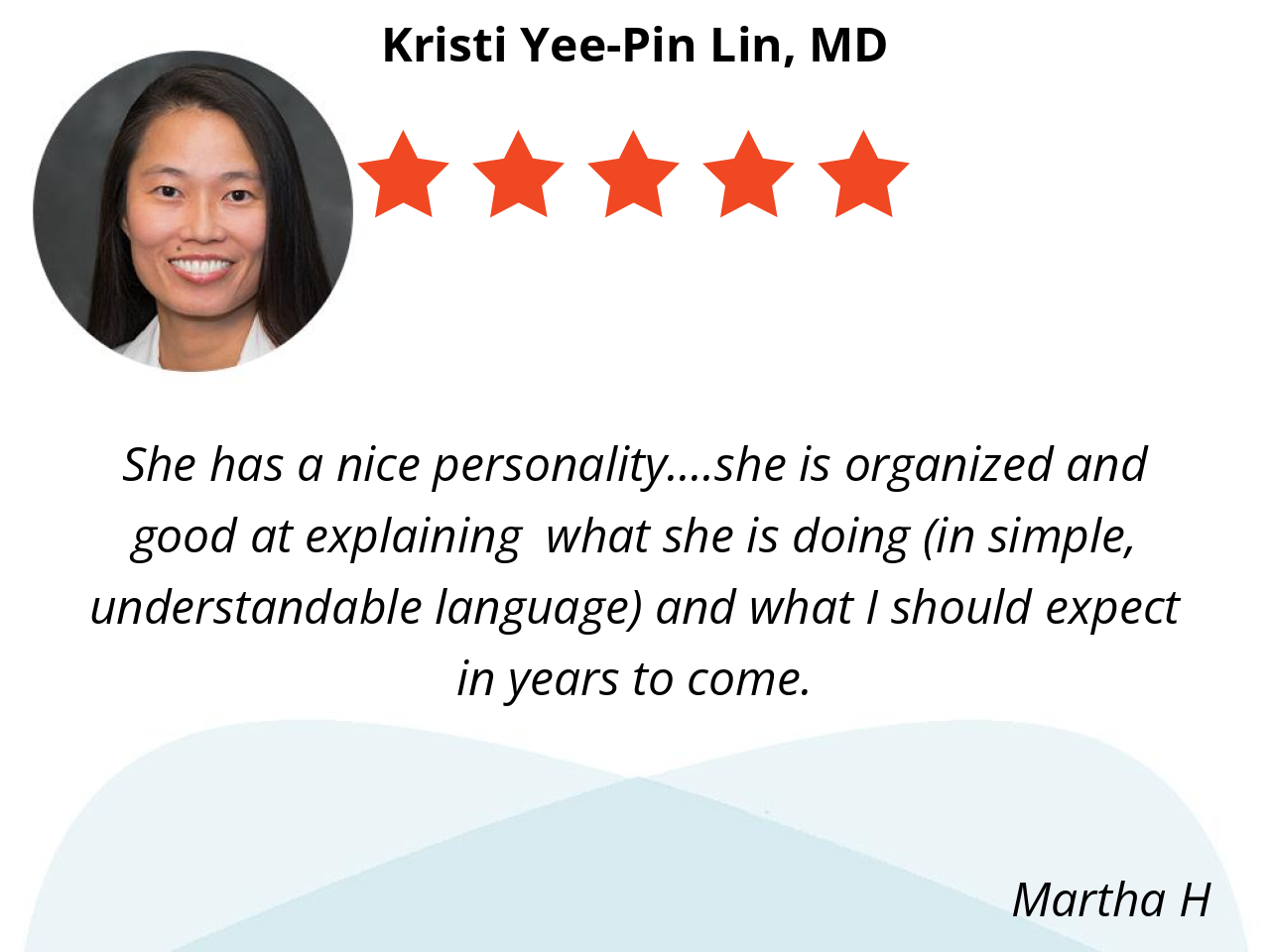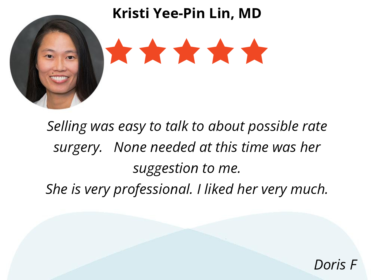 Dr. Lin is very polite, interested in and listens to her patient, very professional and very intelligent and very capable. 5 Stars plus