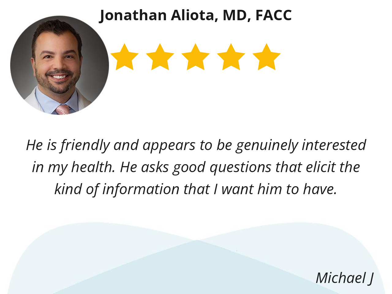 Dr. Aliota is friendly, easy to talk to, and consistently professional in his approach. I feel heard and respected during every interaction.