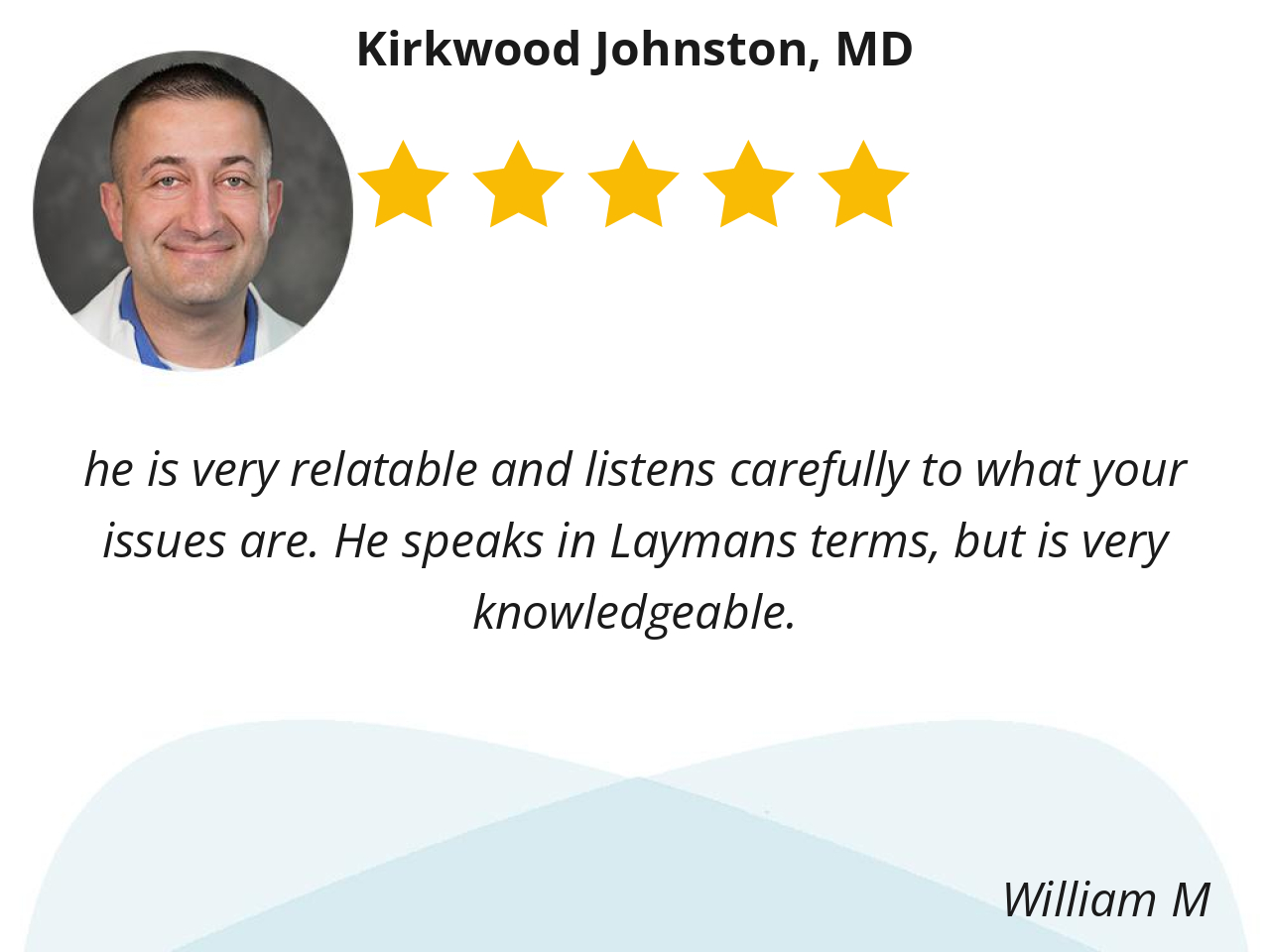 Dr. Johnston is prompt, listens to you, and cares about his patients. I am thrilled to have him as a trusted doctor.