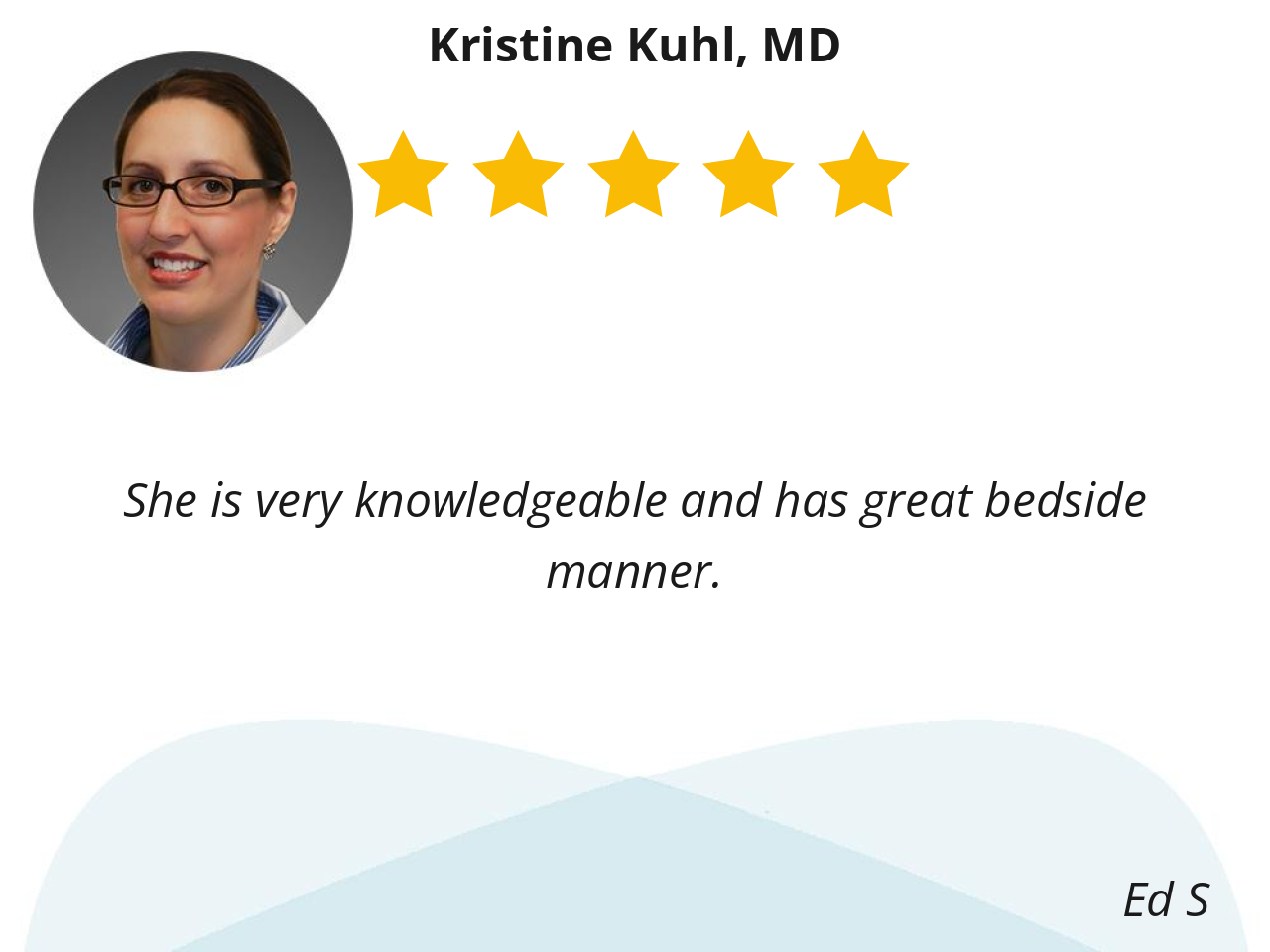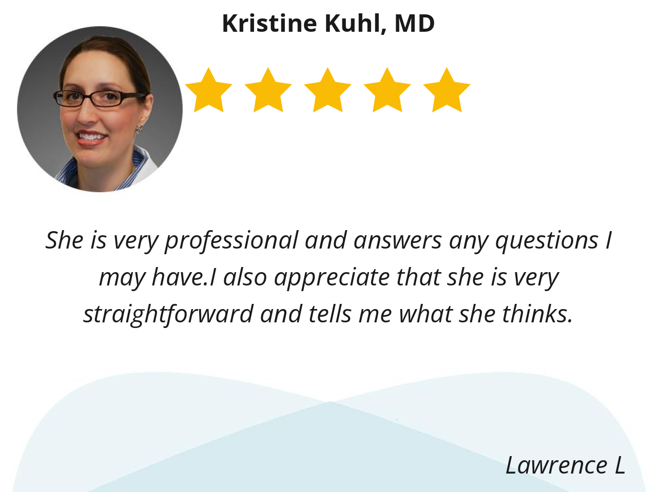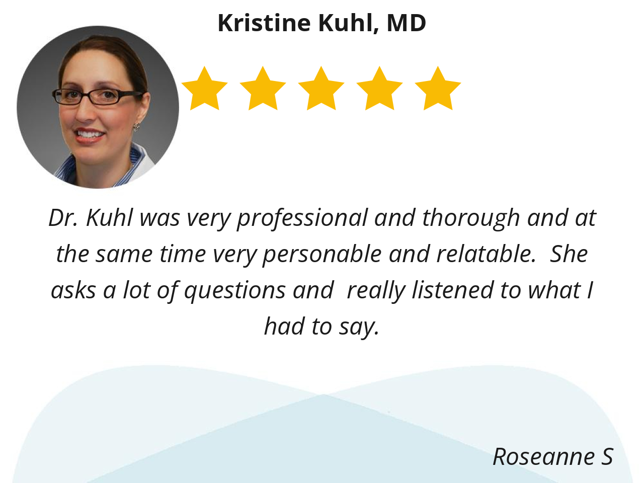 Dr. Kuhl was very professional and thorough and at the same time very personable and relatable. She asks a lot of questions and really listened to what I had to say.