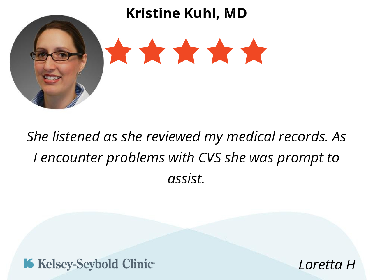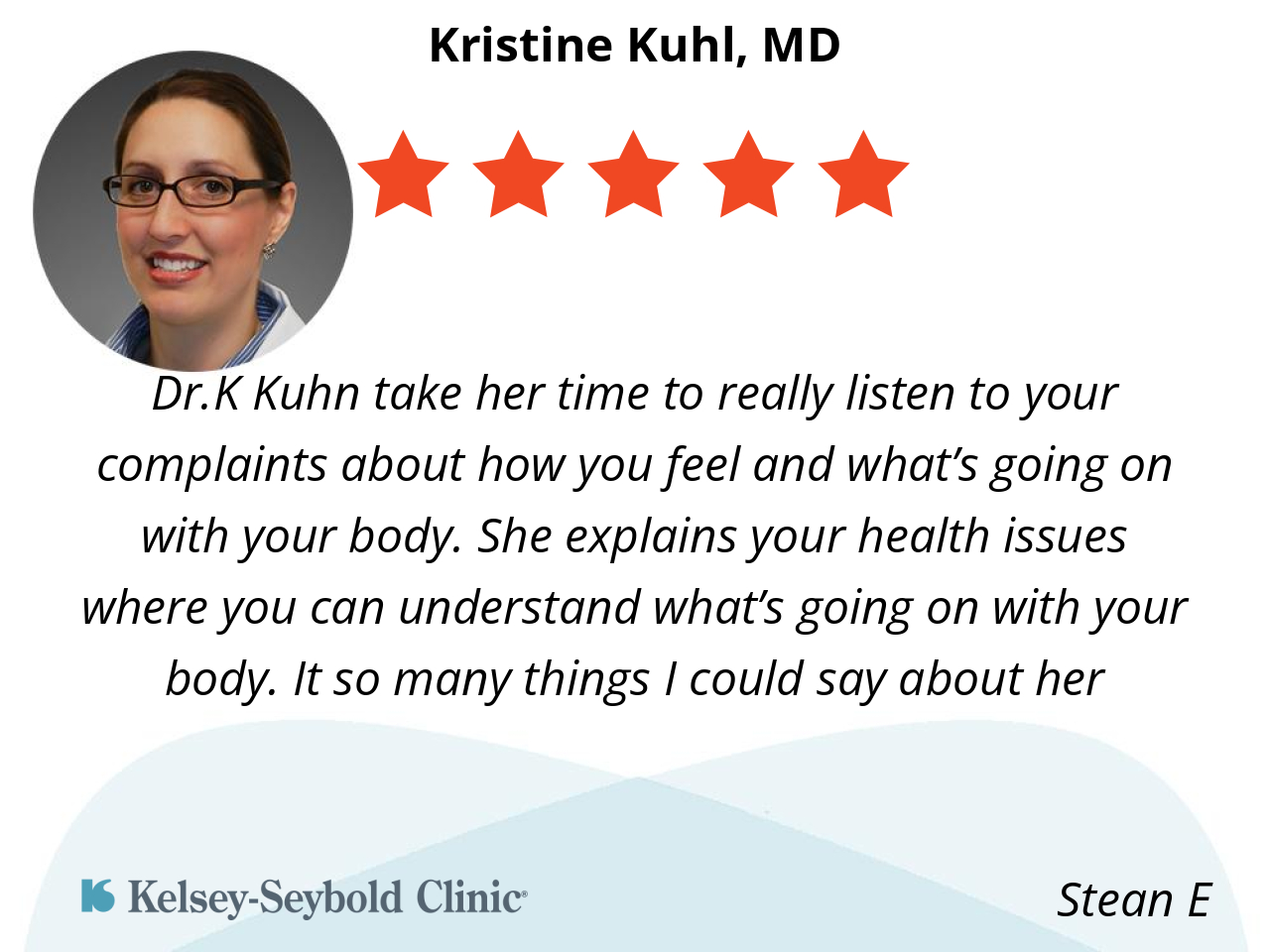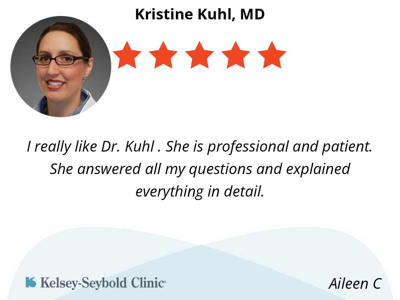 Dr. Kuhl was very professional and thorough and at the same time very personable and relatable. She asks a lot of questions and really listened to what I had to say.