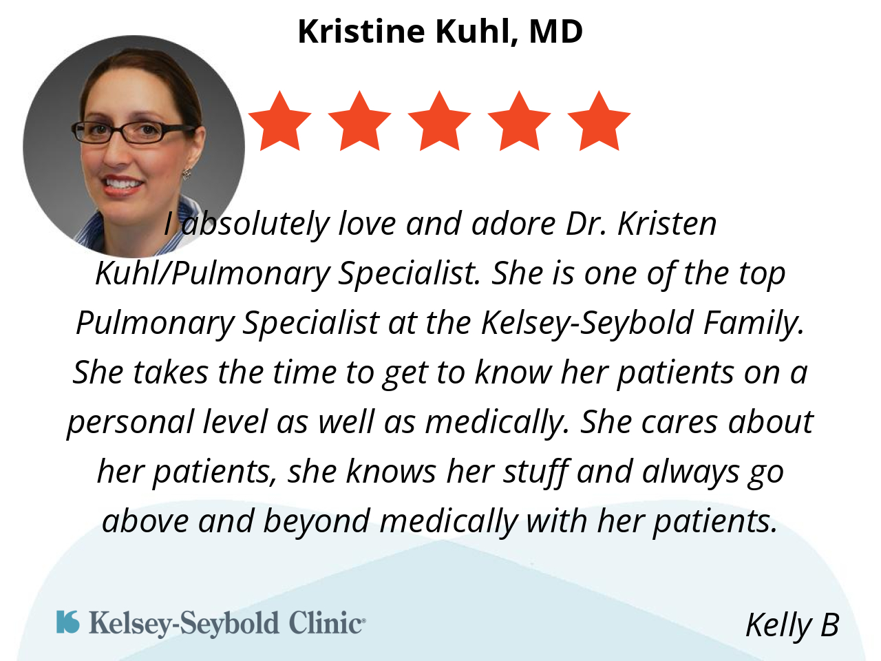 I absolutely love and adore Dr. Kristen Kuhl/Pulmonary Specialist. She is one of the top Pulmonary Specialist at the Kelsey-Seybold Family. She takes the time to get to know her patients on a personal level as well as medically. She cares about her patients, she knows her stuff and always go above and beyond medically with her patients.