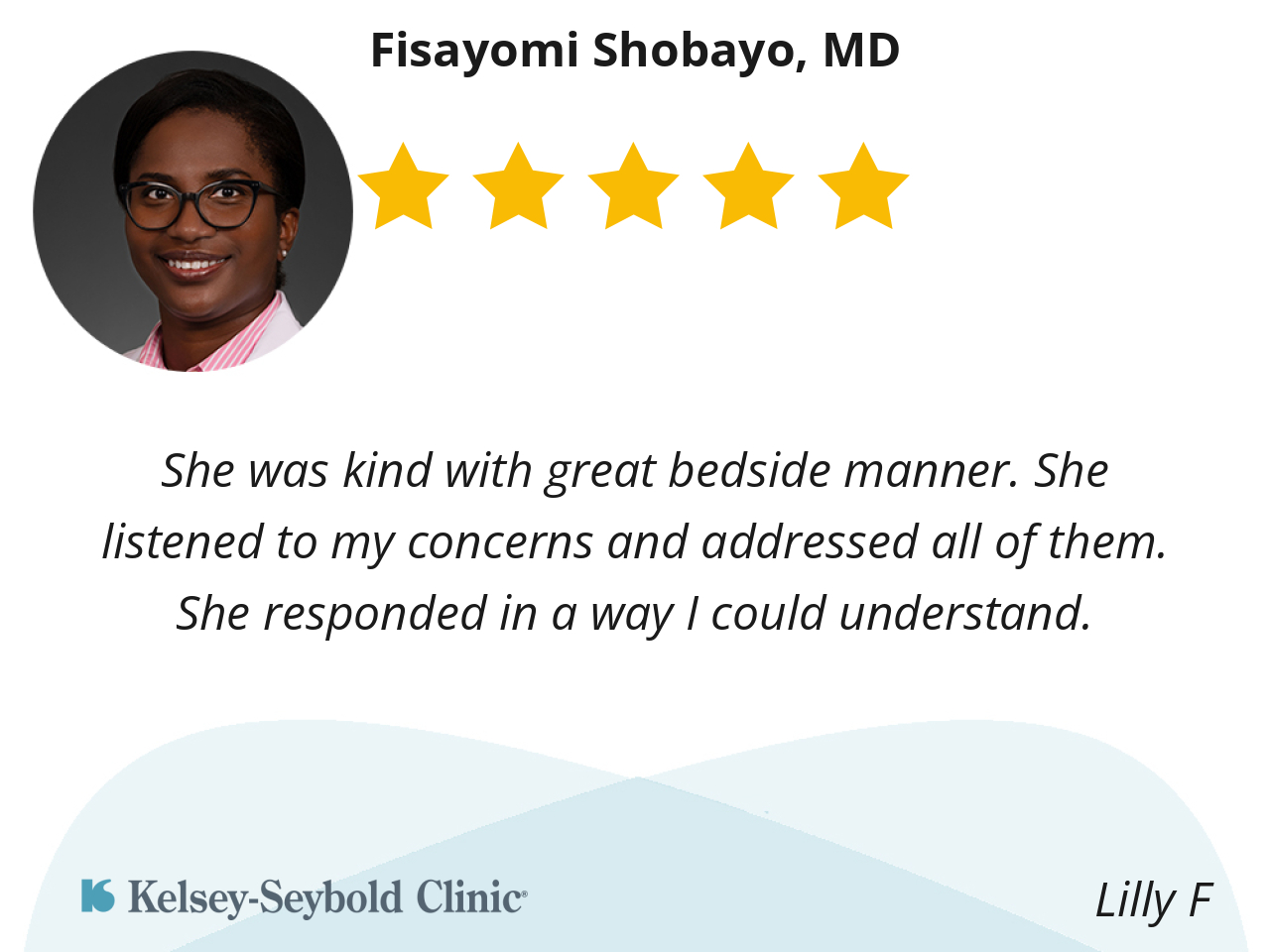 Dr. Shobayo is not only comprehensive in her examinations, she is genuinely enthusiastic about the science--and that enthusiasm is a comfort to me. It indicates a doctor cares a lot about what she does.