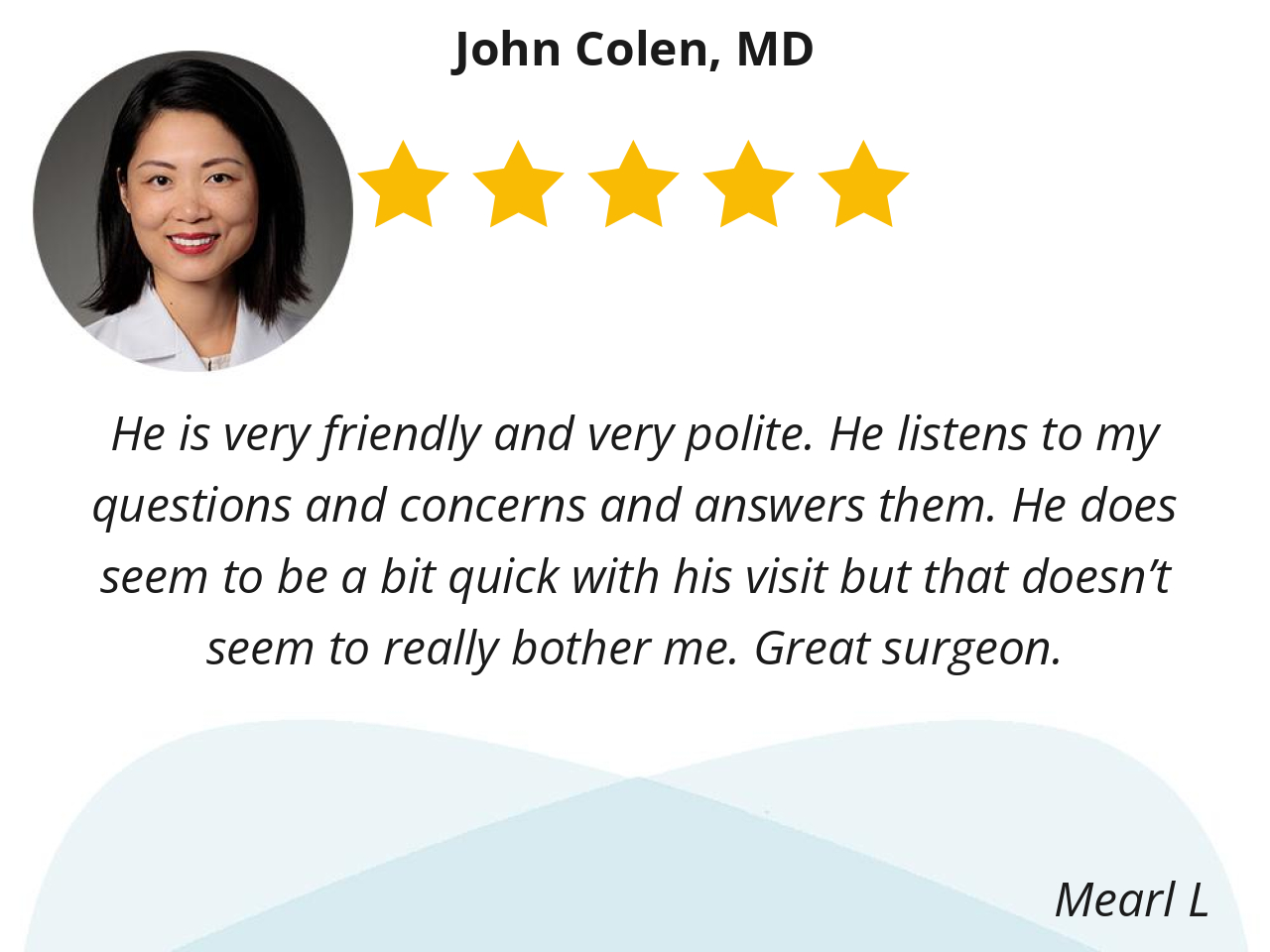 He is very friendly and very polite. He listens to my questions and concerns and answers them. He does seem to be a bit quick with his visit but that doesn’t seem to really bother me. Great surgeon.