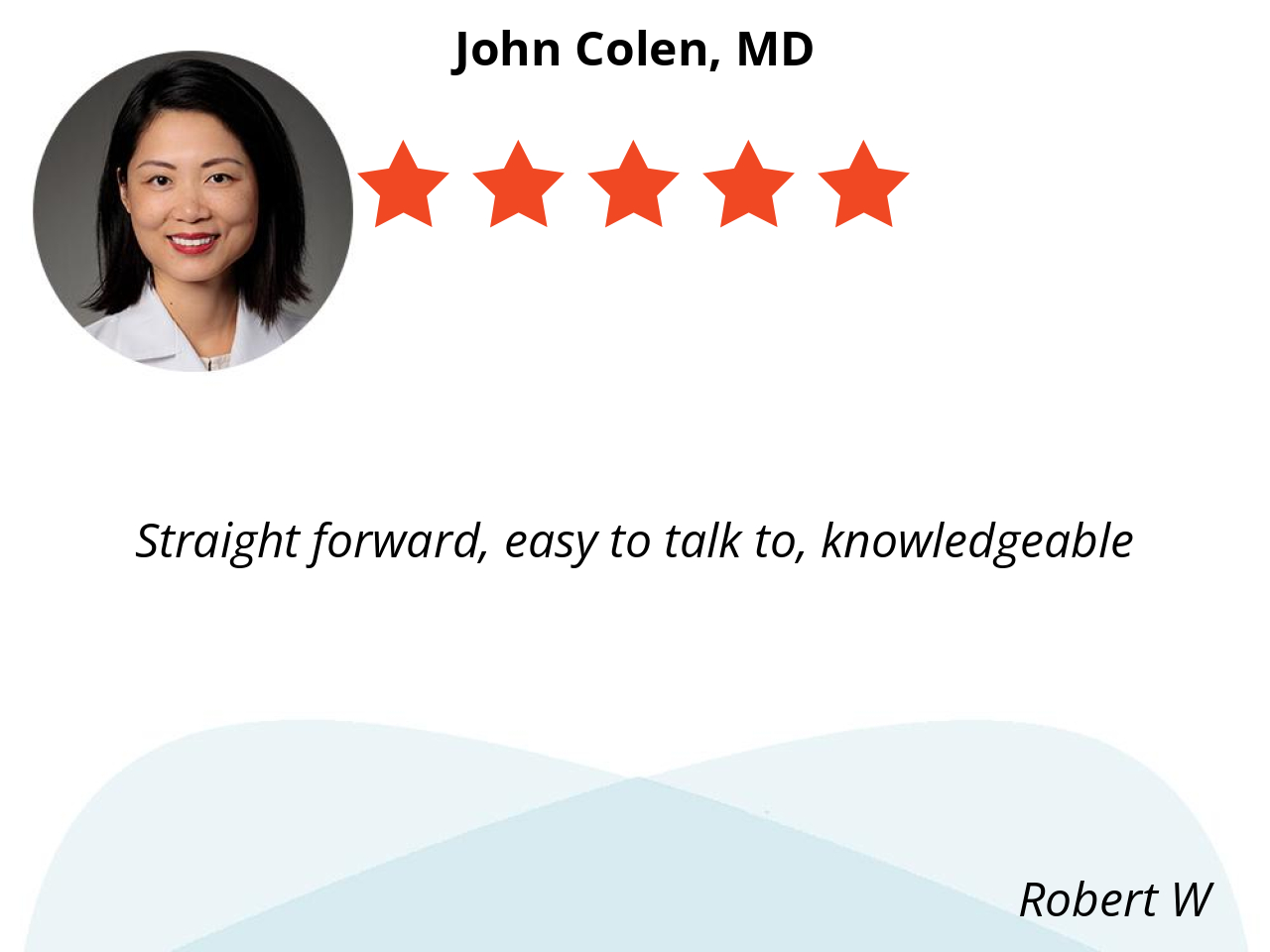 Dr. Colen is very personable, energetic and has a positive vibe. He is professional, understands my concerns and acts on my ultra sound test results. I appreciate his concern and care to my medical condition.