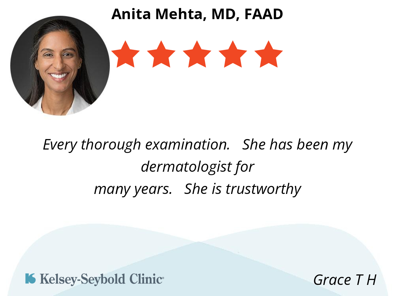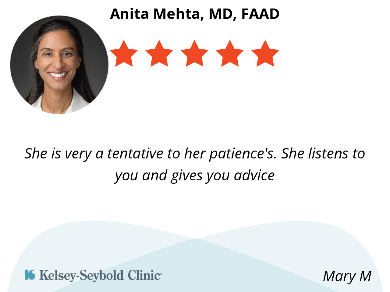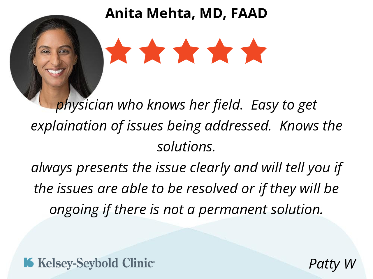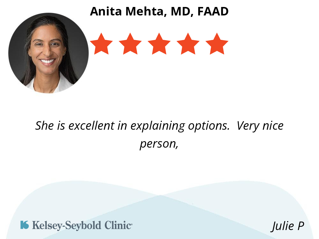 Dr. Anita Mehta is an excellent dermatologist—knowledgeable, caring, and thorough. Highly recommend.