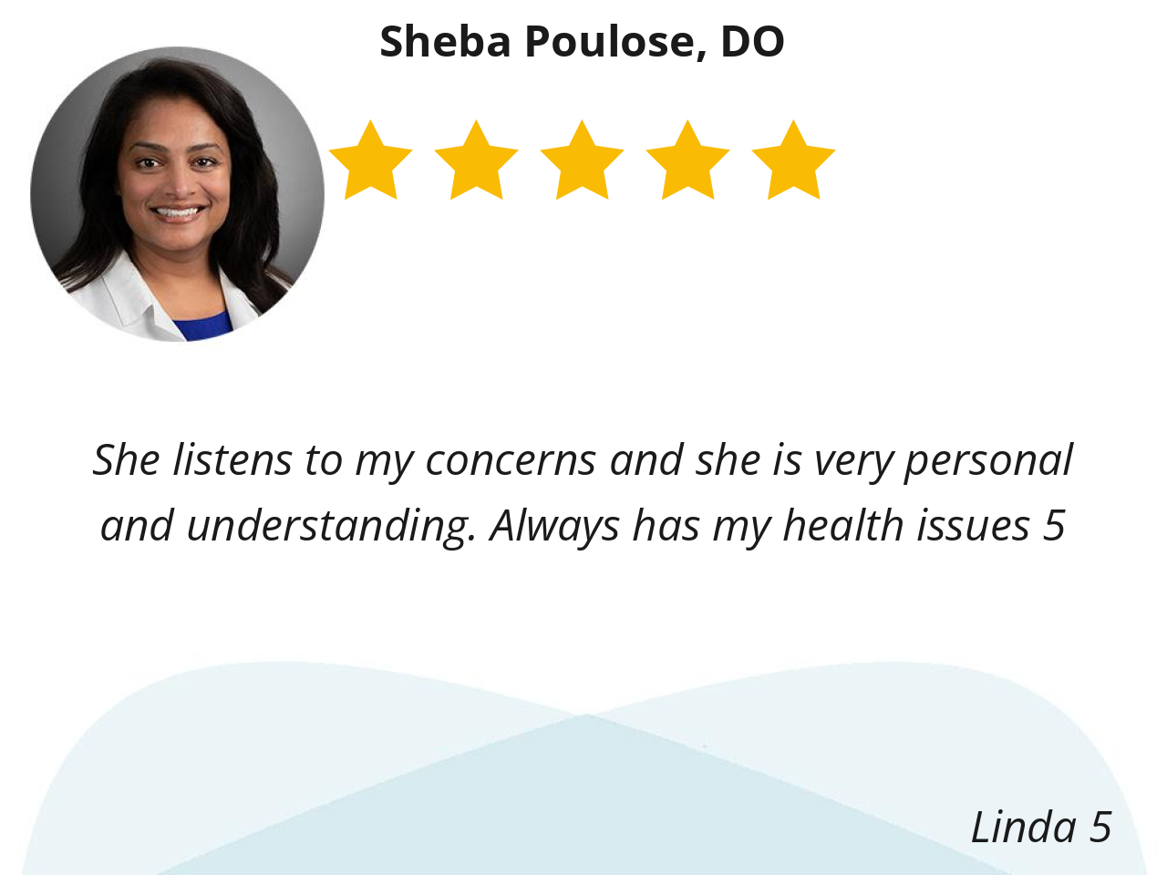 Dr. Poulose is very considerate and compassionate. She has good bed side manner's and she listens. All the while she's very professional. I also like her nurse, Nurse Frank... Even though I don't see Dr. Poulose a lot he always knows who I am, he's very patient and gentle with me. He listens well also and he genuinely seems concerned about me. They make a Great Team.