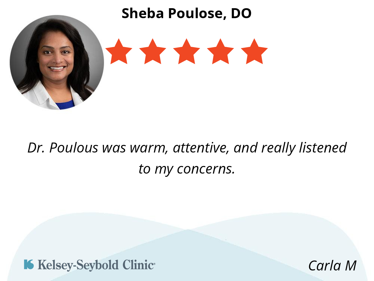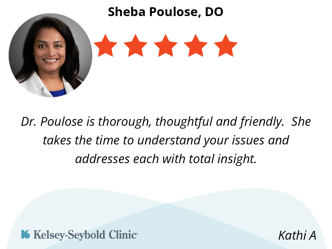 Dr. Poulose is thorough, thoughtful and friendly. She takes the time to understand your issues and addresses each with total insight.
