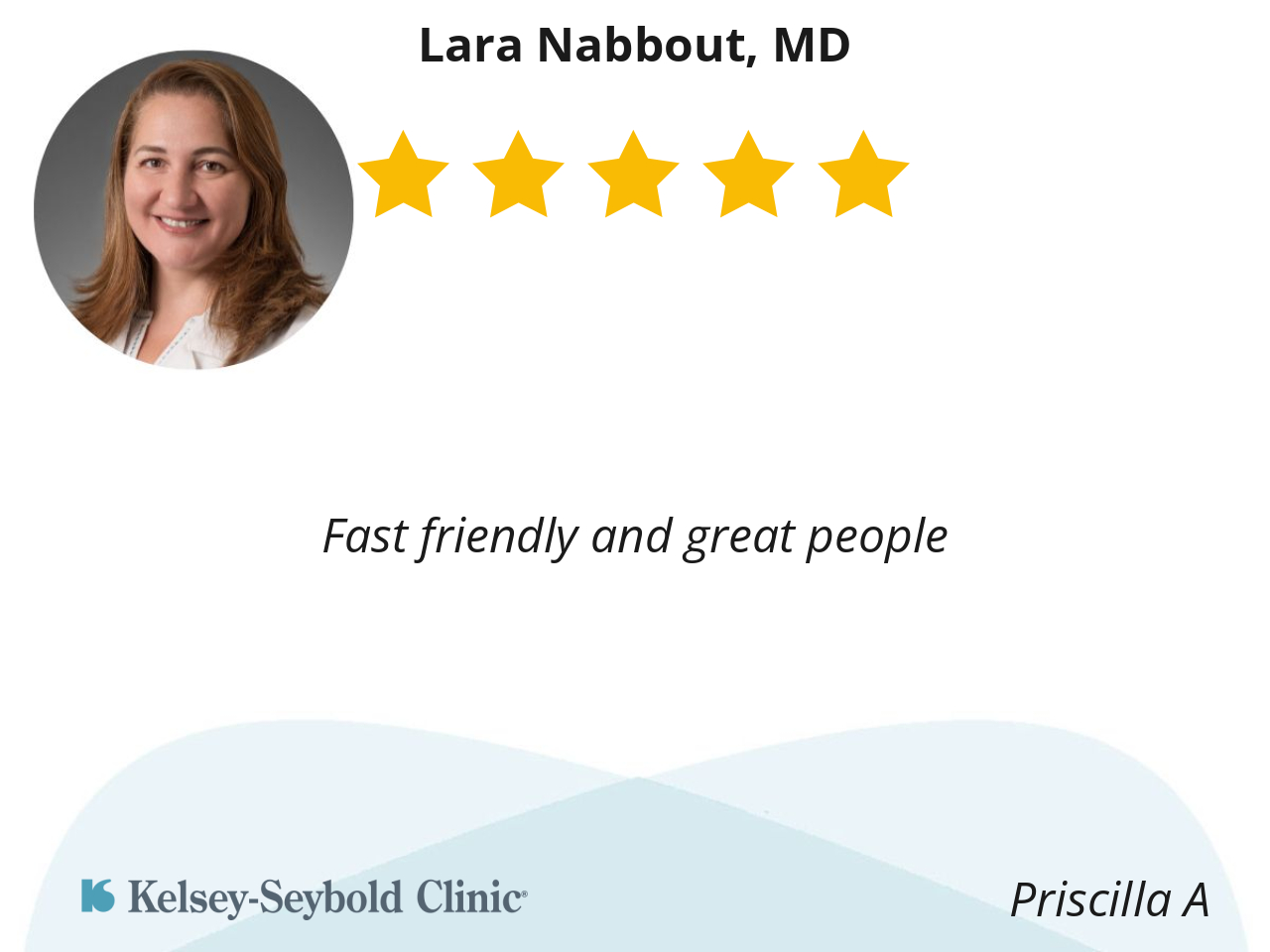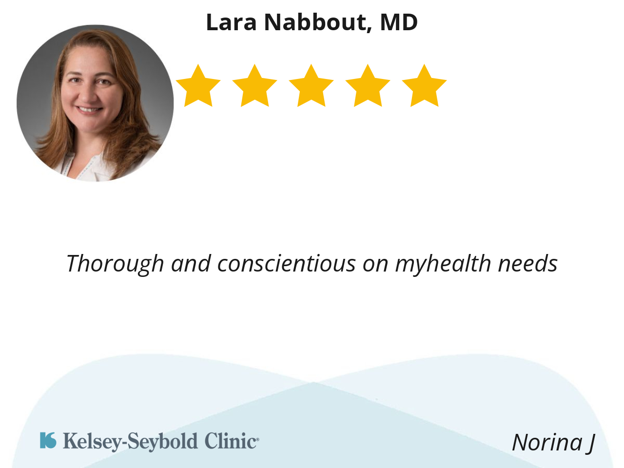 Dr. Nabbout is a natural professional. She’s listens to her patients and gives the best advice to aid in them staying well. She’s thorough when reviewing your files and makes you feel very comfortable in the doctor, patient dialogue. She’s also very expeditious in her follow-up messages. Thank You Dr. Nabbout 🌹