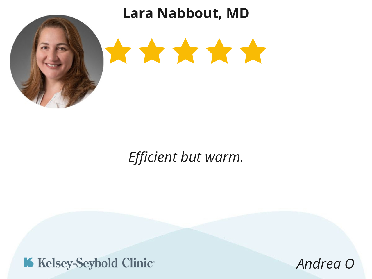 Dr. Nabbout is extremely understanding, patient and receptive. Really good at addressing concerns and answering questions. Also, always has the best diagnosis and courses of action - previously also helped diagnose a hairline fracture that an ortho had missed. She is a great doctor!