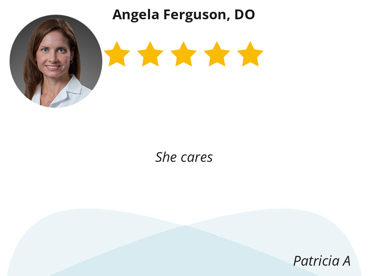 I did not get to see Dr Ferguson . I saw her assistant. Don’t remember her name. She was very good and concerned about my BP. I hope to see Dr Ferguson next time. But was very satisfied with her Assistant