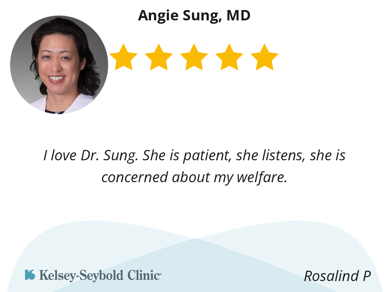 I love Dr. Sung. She is patient, she listens, she is concerned about my welfare.