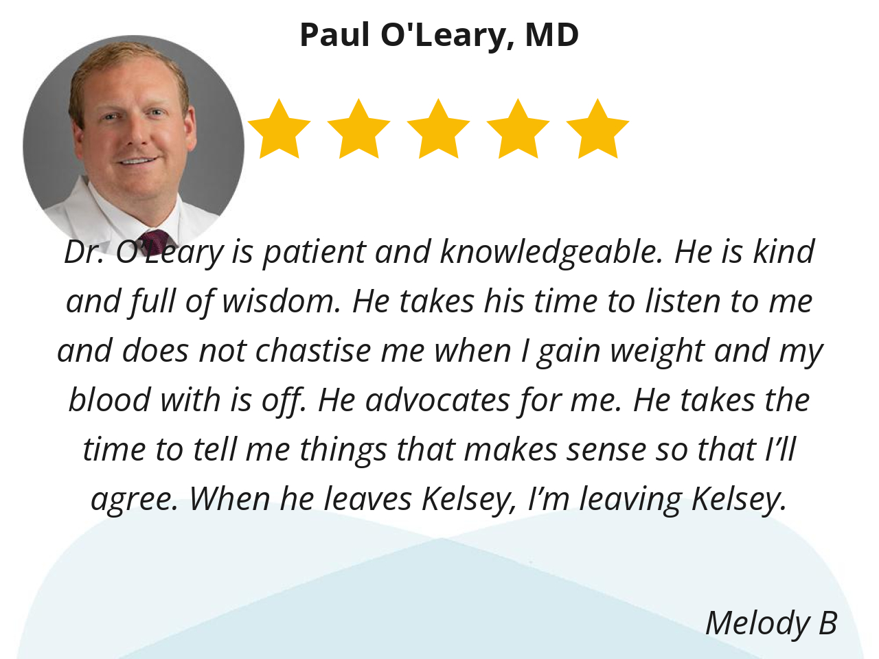 Dr. O’Leary is patient and knowledgeable. He is kind and full of wisdom. He takes his time to listen to me and does not chastise me when I gain weight and my blood with is off. He advocates for me. He takes the time to tell me things that makes sense so that I’ll agree. When he leaves Kelsey, I’m leaving Kelsey.