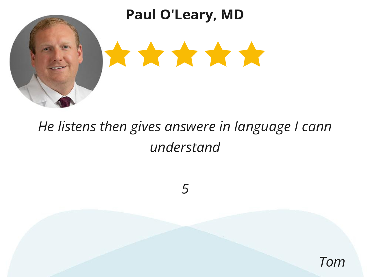 I like Dr.Paul O'leary. Because he is a very kind and compassion for his patience and bed side manner!! I've been with Dr. O'LEARY FOR about 6 to 7 years I believe!! I like. His care and kindness he gives to his patients!! I will continue to see him as long as I can!!! Thank you Dr. O'leary