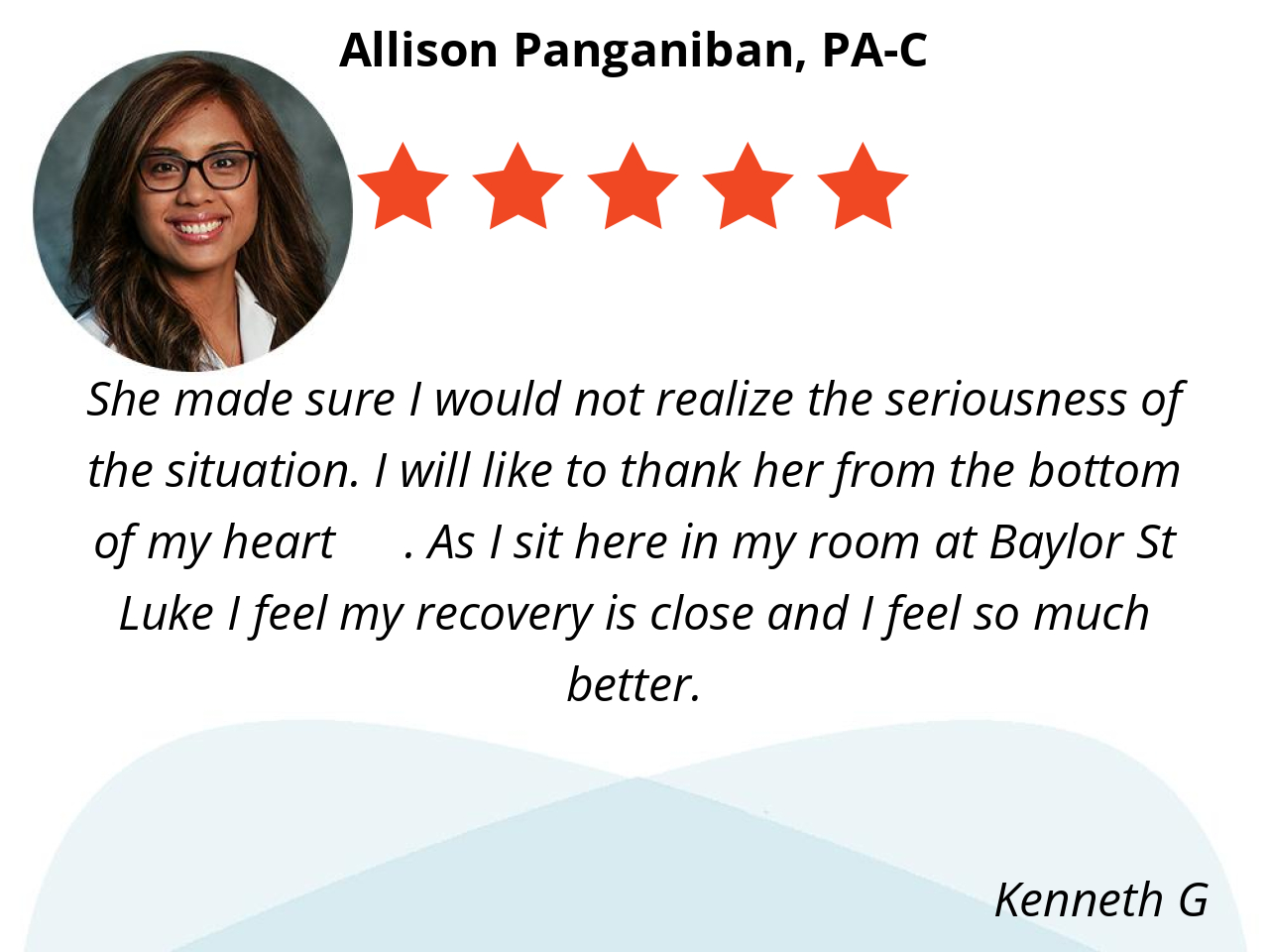 I think PA Allison Panganiban was really great at listening to my problems and making me feel heard while doing everything possible to address the concerns. I appreciate the thoroughness of the exam and prescribing medicines that will best help me with my concerns addressed during the visit.