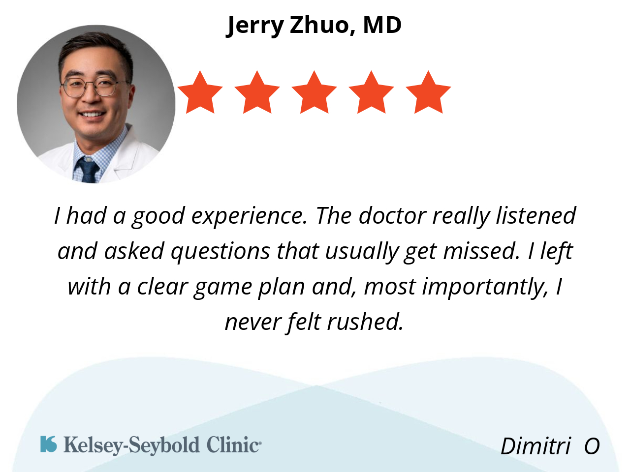 Dr. Zhou provided exceptional care throughout my entire visit. He took the time to thoroughly explain my OAB and treatment options. He even recommended a more cost effective RX alternative, saving me money. the clinical staff was friendly and made me respected, I highly recommend Kelsey Seybold