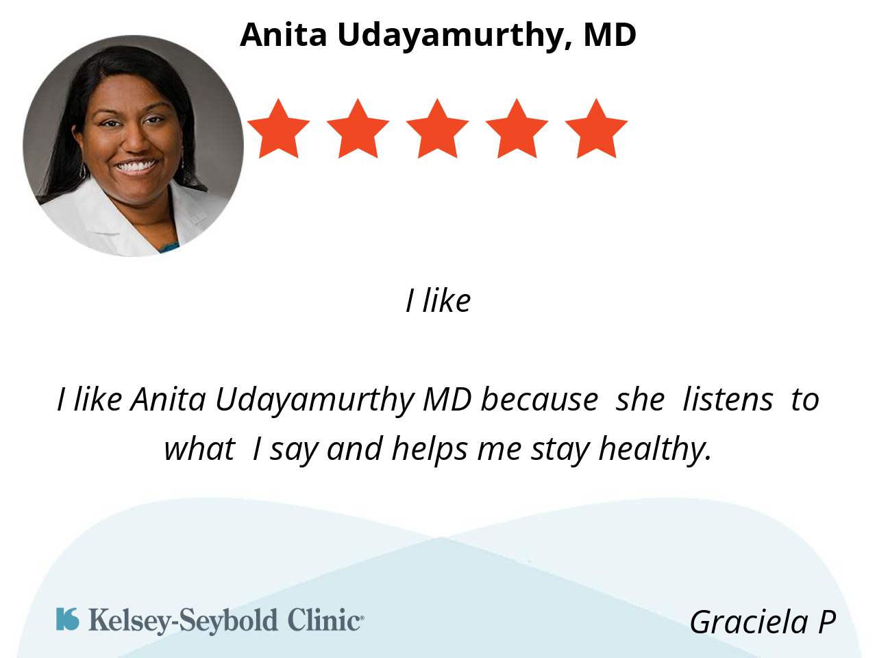 I like Anita Udayamurthy MD because she listens to what I say and helps me stay healthy.
